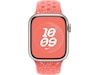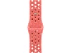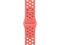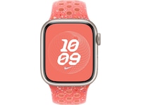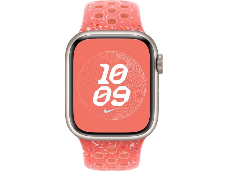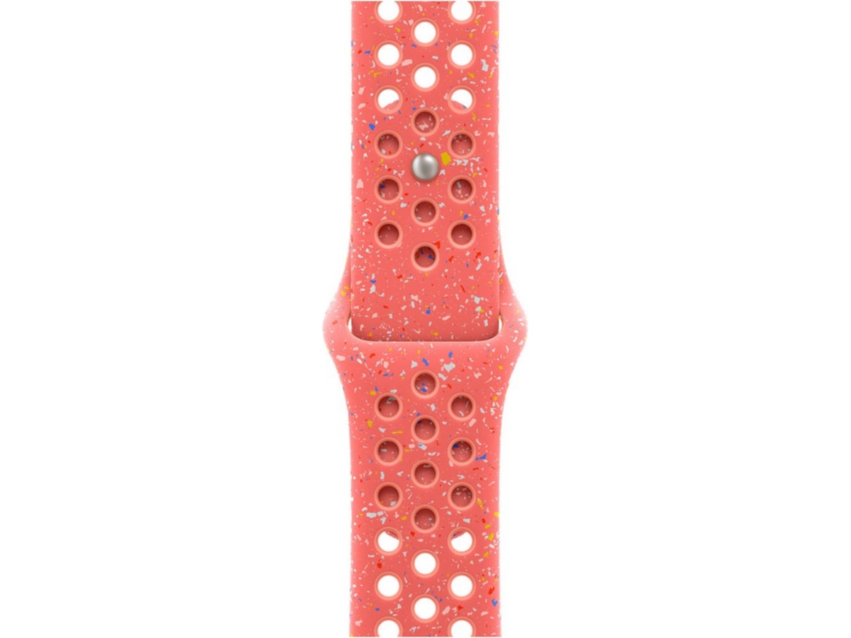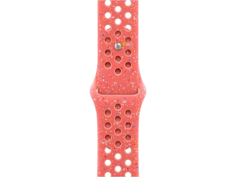 Nike Sport Band er laget med presstøpte perforeringer som gir huden luft. Remmen er slitesterk, men likevel overraskende myk. Den har fargerike flak som skaper et tilfeldig mønster, noe som gjør hver rem helt unik. Det jevne, solide materialet former seg elegant rundt håndleddet og føles behagelig mot huden. En låsepinne av aluminium har en stilren, matt finish.