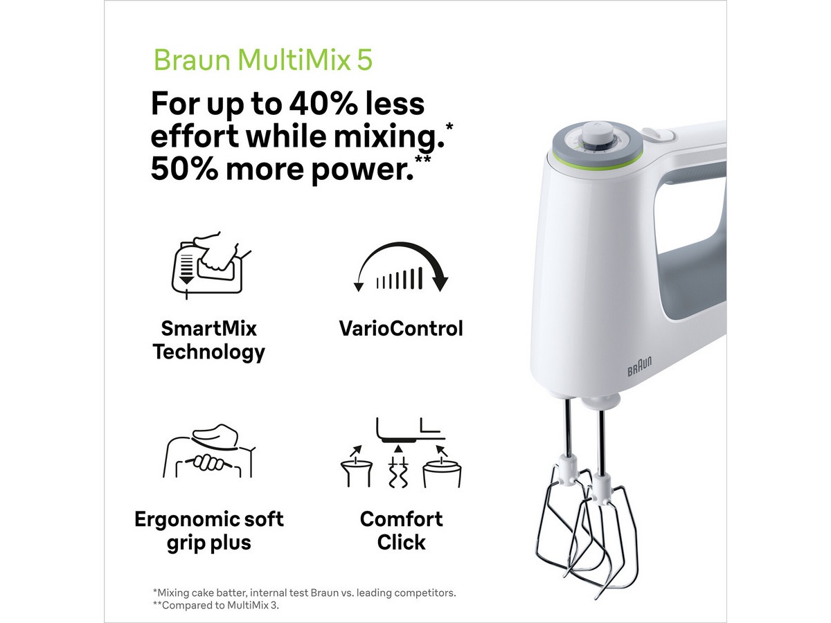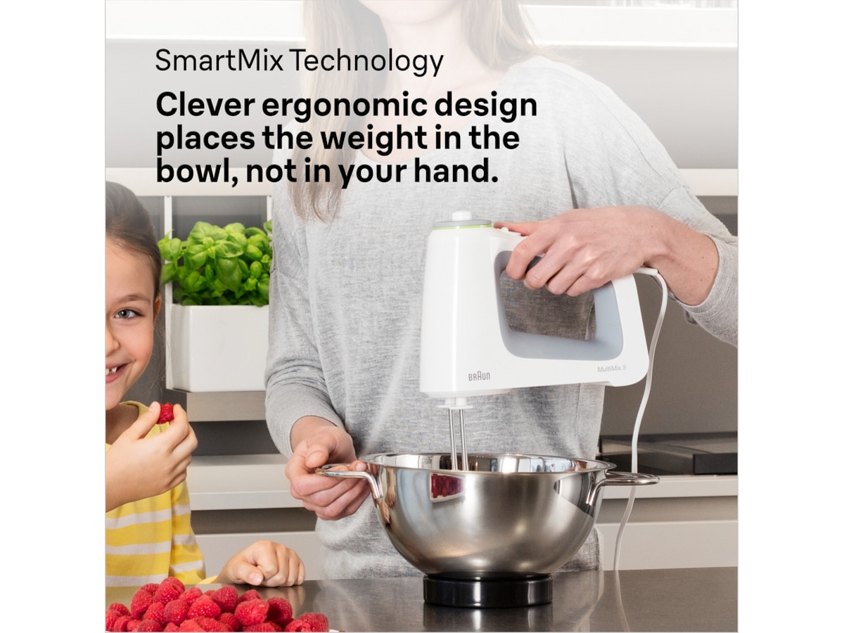 Den smarte SmartMix-teknologien plasserer vekten i bollen, ikke i hånden din, noe som gir opptil 40 % mindre anstrengelse under miksingen.* Og den leveres med en svært kraftig motor på 700 W slik at du kan nyte uanstrengt bakekreativitet hver gang. Det er 50 % mer kraft sammenlignet med MultiMix 3. VarioControl leverer sømløs variabel hastighetskontroll for raskt og enkelt valg av hastigheter. * Kakedeig, intern test Braun vs. ledende konkurrenter.