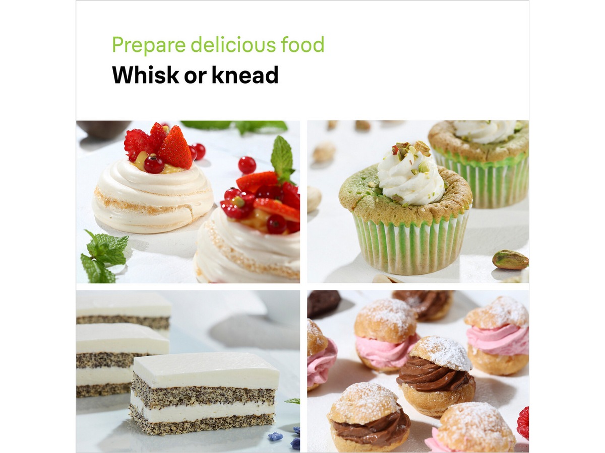 På grunn av den smarte designen fester stavmikseren alt tilbehør intuitivt til fronten, noe som gjør at du kan opprettholde den samme komfortable håndstillingen for miksing, miksing og hvile uansett hvilket tilbehør som brukes. Siden den står stabilt med alt slags tilbehør, holder arbeidsområdet ditt rent, slik at du raskt kan gå videre til neste trinn uten avbrudd.