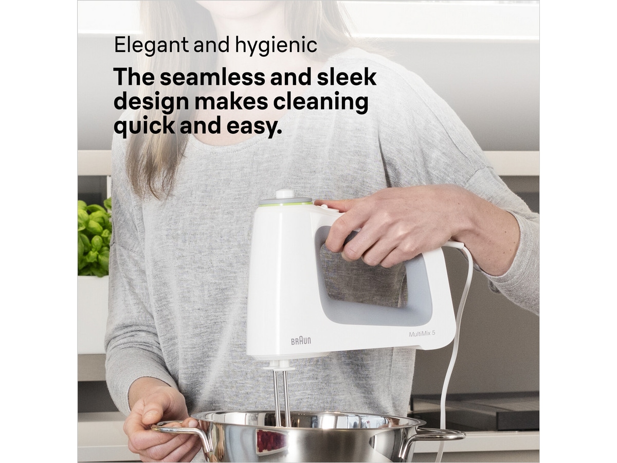 Smart vertikal motordesign. Ved å plassere motoren rett over tilbehøret, ledes vekten ned i bollen, vekk fra hånden din. Denne komfortable ergonomiske designen gir en høyere grad av bekvemmelighet og opptil 40 % mindre anstrengelse under miksing* for å hjelpe deg med å tilberede favorittoppskriftene dine – spesielt viktig for lange miksetider. *Kakedeig, intern test Braun vs. ledende konkurrenter.
