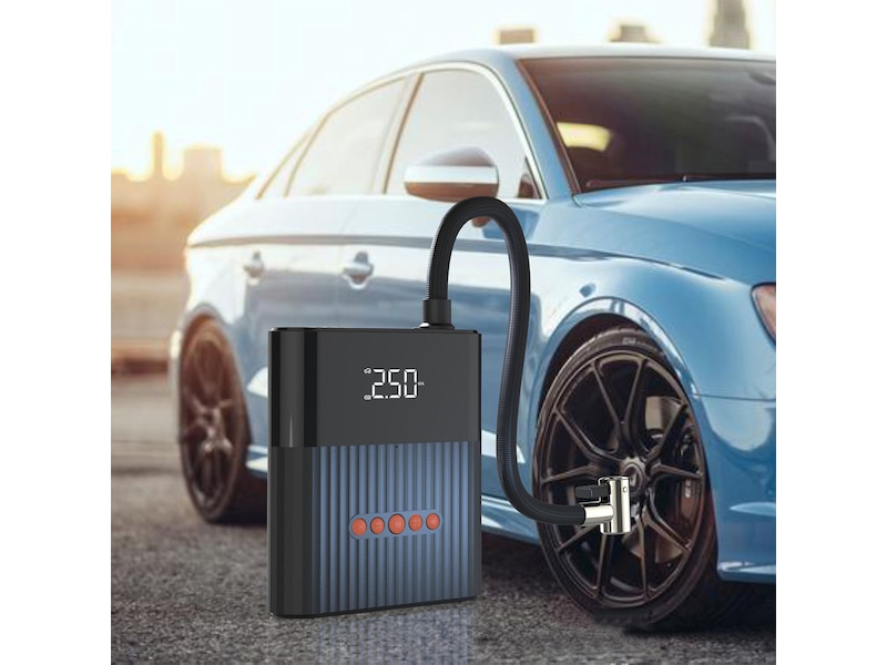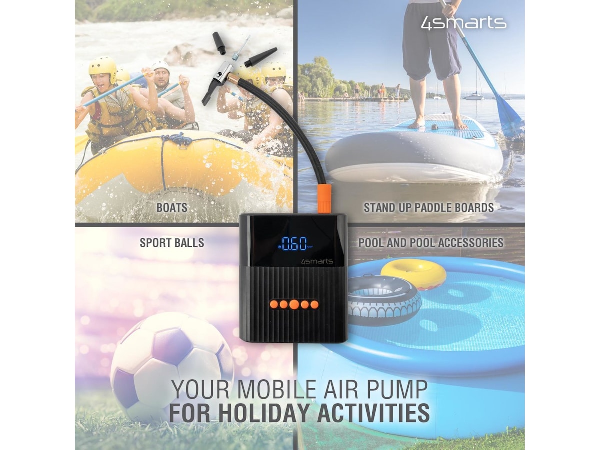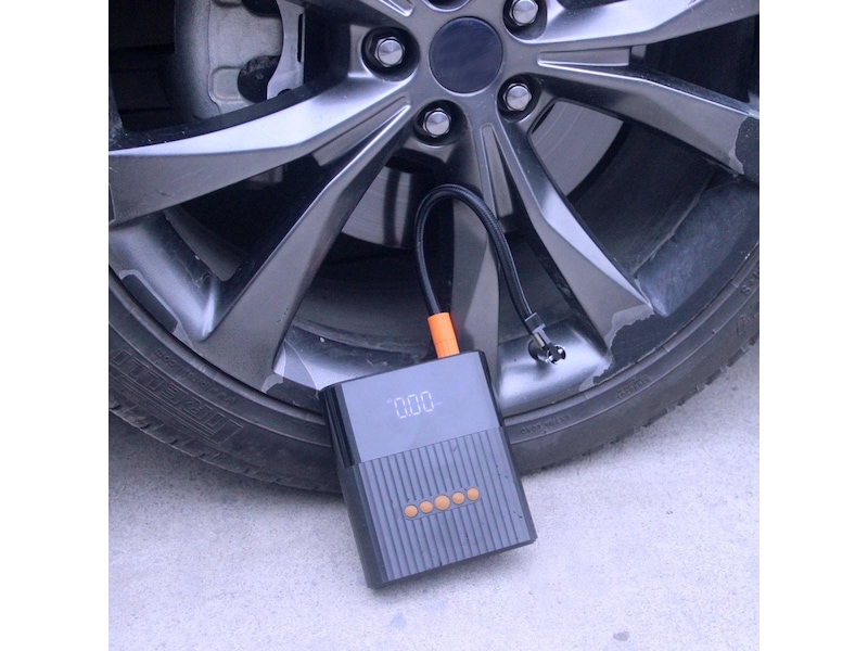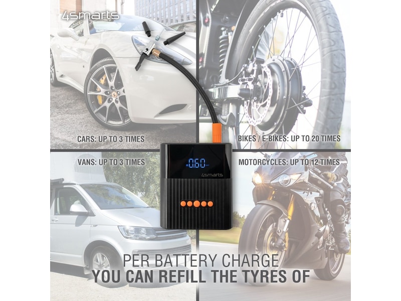 - Effektiv: Den integrerte kraftige kompressoren leveres med forskjellig tilbehørsdeler. Bare koble den aktuelle adapteren til det respektive dekket og still inn det ønskede dekktrykket. Pumpen fungerer automatisk til man har nådd riktig trykk.