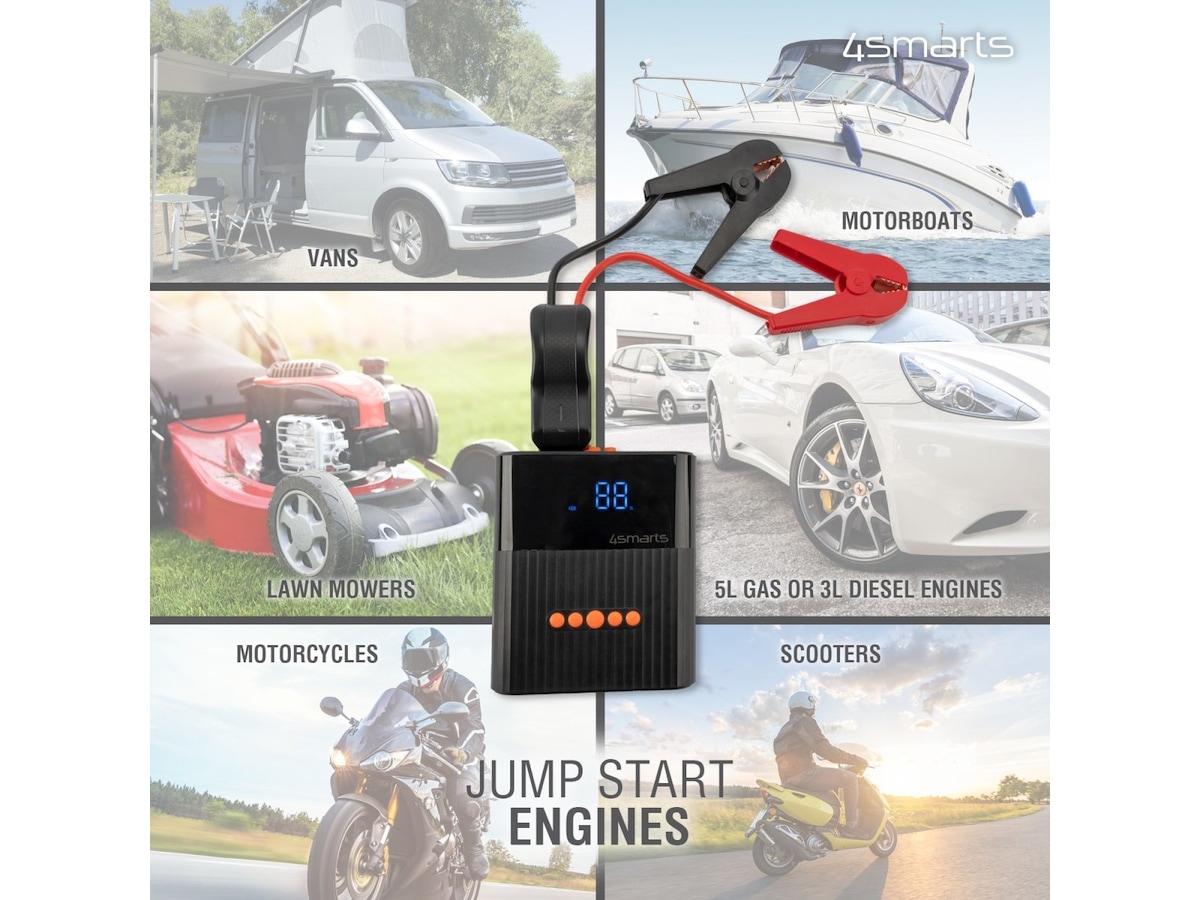 - Kraftig: 8800 mAh starter enkelt bensinmotorer på opptil 5 liter og dieselmotorer på opptil 3 liter. Etter en lang vinter kan du også få start på gressklipperen din eller motorsykkelbatteriet.