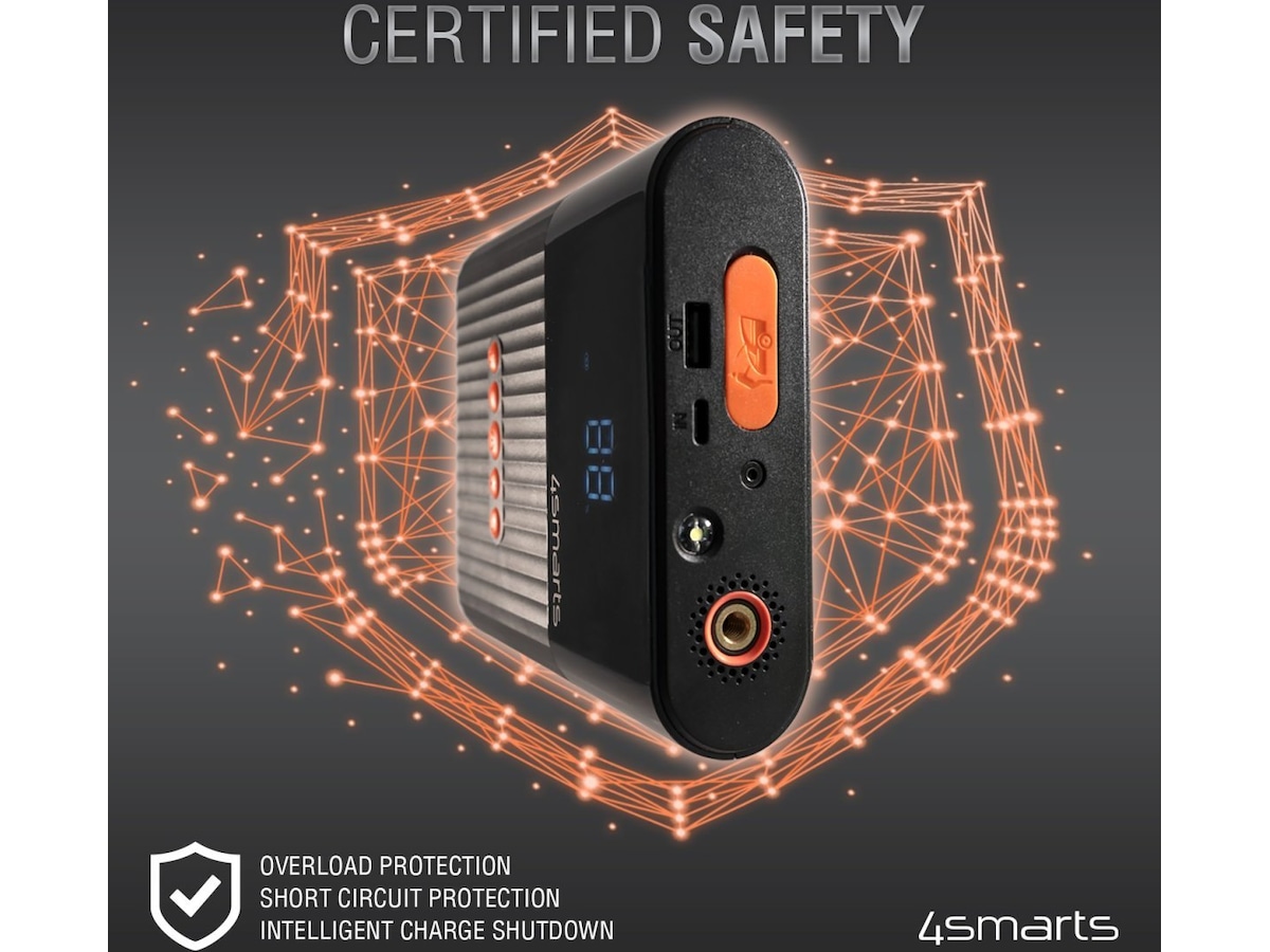 - Sikker: Reinsured sikkerhetsteknologi gir eksplosjonsbeskyttelse og beskyttelse mot omvendt polaritet, og forhindrer kortslutninger, overspenning, overlading og dyp utladning. Intelligent ladestyring beskytter deg, nødladeren din og mobilenhetene dine.