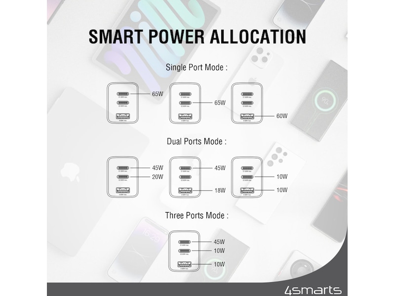 - Lad flere enheter samtidig:Takket være flere porter kan du lade flere enheter samtidig. Du trenger bare én lader til alle enhetene dine.