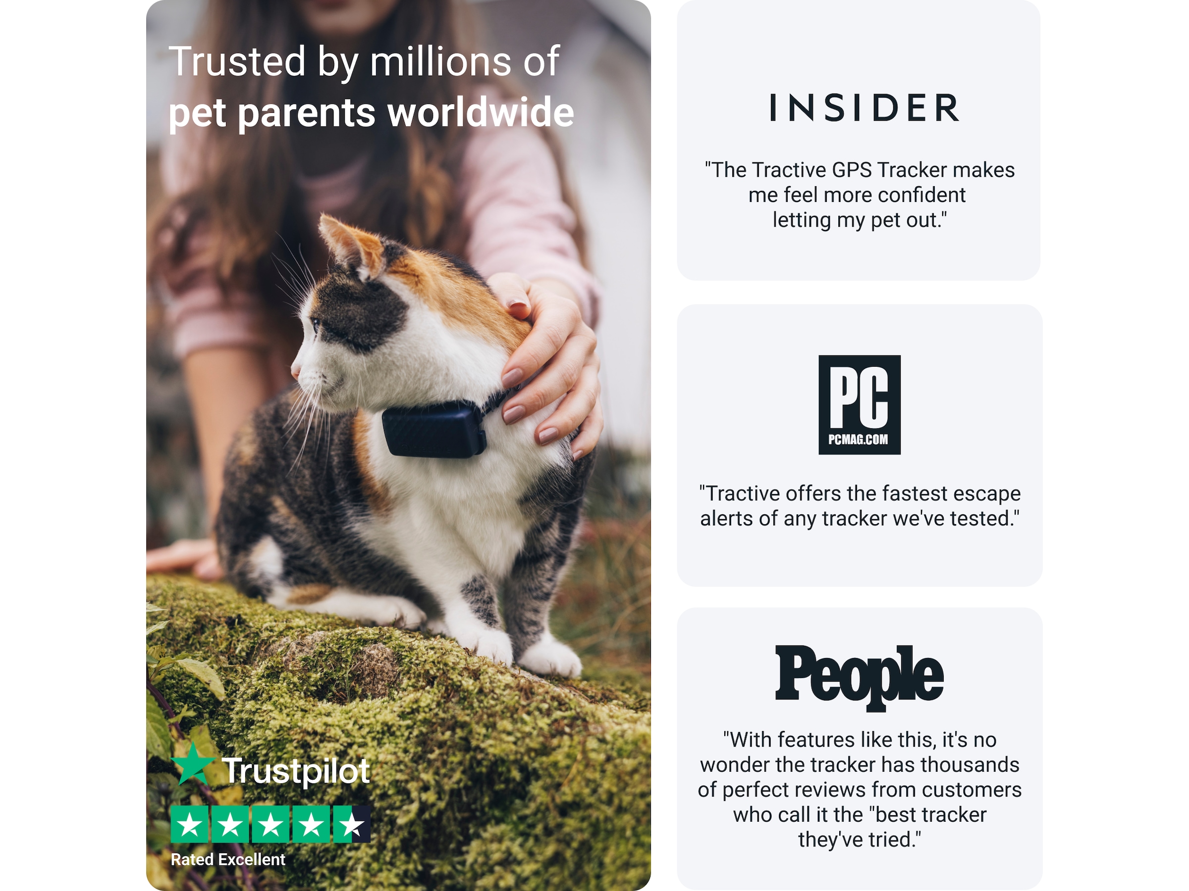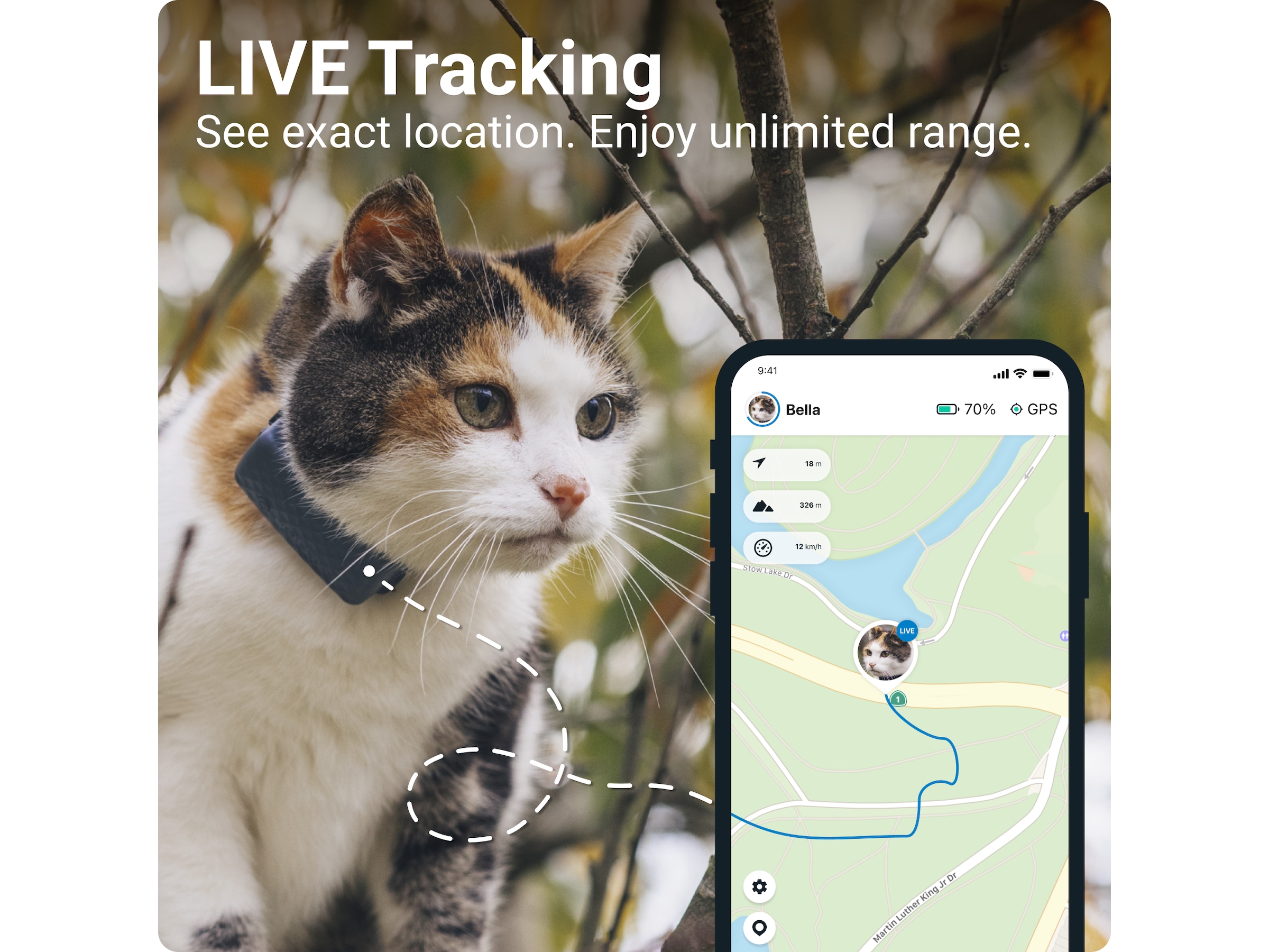 Følg hvert skritt med posisjonsoppdateringer hvert 2.–3. sekund. Tractive GPS-tracker for katter har en satellittteknologi som lar deg spore dem hvor som helst, uten å måtte bekymre deg for at de går utenfor rekkevidde.