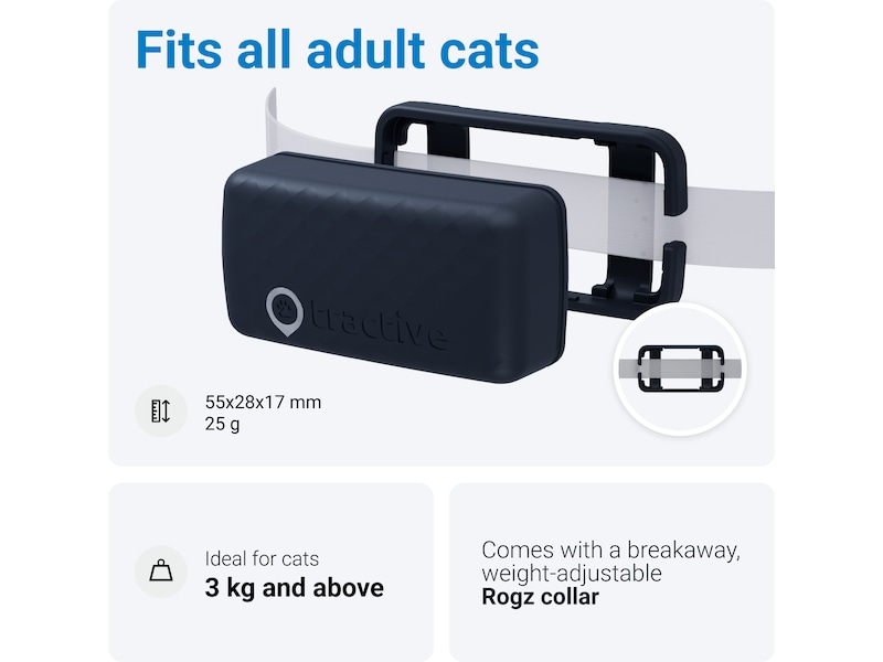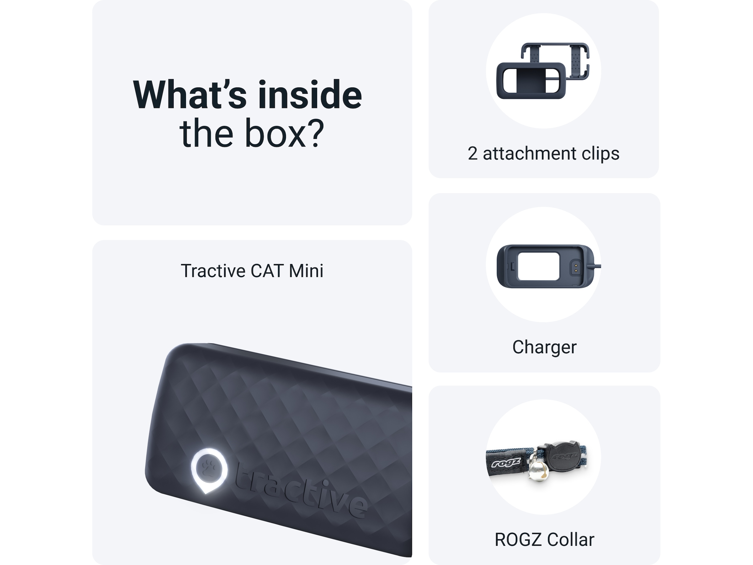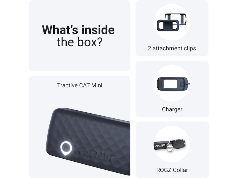 Så hvordan kommer du i gang? Det er enkelt: bare skaff deg en GPS-tracker for katt. Velg et abonnement - abonnementer fås fra 60 kr/mnd - og begynn å spore med den gratis Tractive GPS-appen. GPS-trackeren leveres med et gratis, brukervennlig Rogz-sikkerhetshalsbånd og 2 forskjellige festeklemmer.