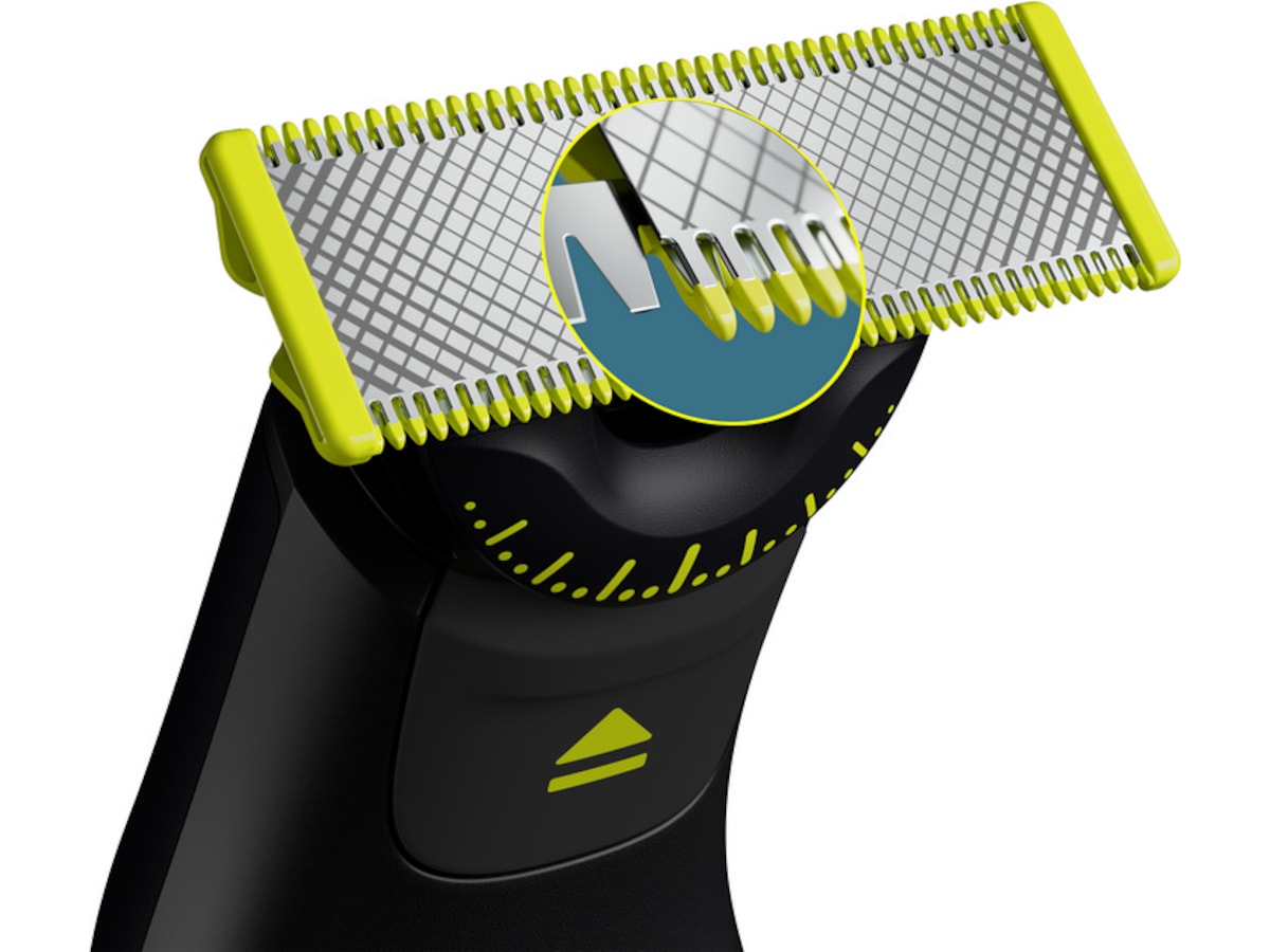 Philips OneBlade er en revolusjonerende teknologi utviklet for ansiktshår. Den kan barbere alle hårlengder. Det doble beskyttelsessystemet – et glidende belegg og avrundede tupper – gjør barberingen enklere og mer behagelig. Barberingsteknologien består av en hurtigbevegende kutteenhet (12 000 ganger per minutt), så den er effektiv, selv på lengre hår.