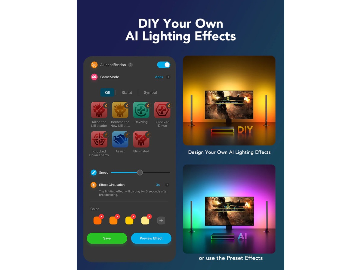 CogniGLow™-algoritmen vår er utviklet internt, og analyserer og behandler over 100 000 bilder for hvert kompatibelt spill, og gjør det mulig med nesten null forsinkelser i sanntid av handlinger og hendelser i spillet, som valg av figur, bruk av gjenstander og boss-drap, gir gamere en helt ny avansert og immersiv lysopplevelse. AI-effekter er foreløpig kompatible med Apex Legends, Valorant, Overwatch og League of Legends, og flere spill vil komme snart.
