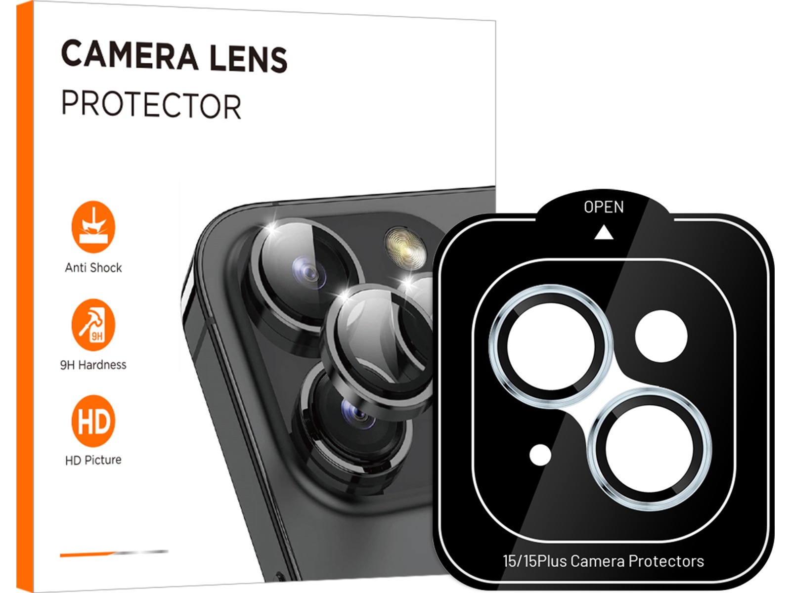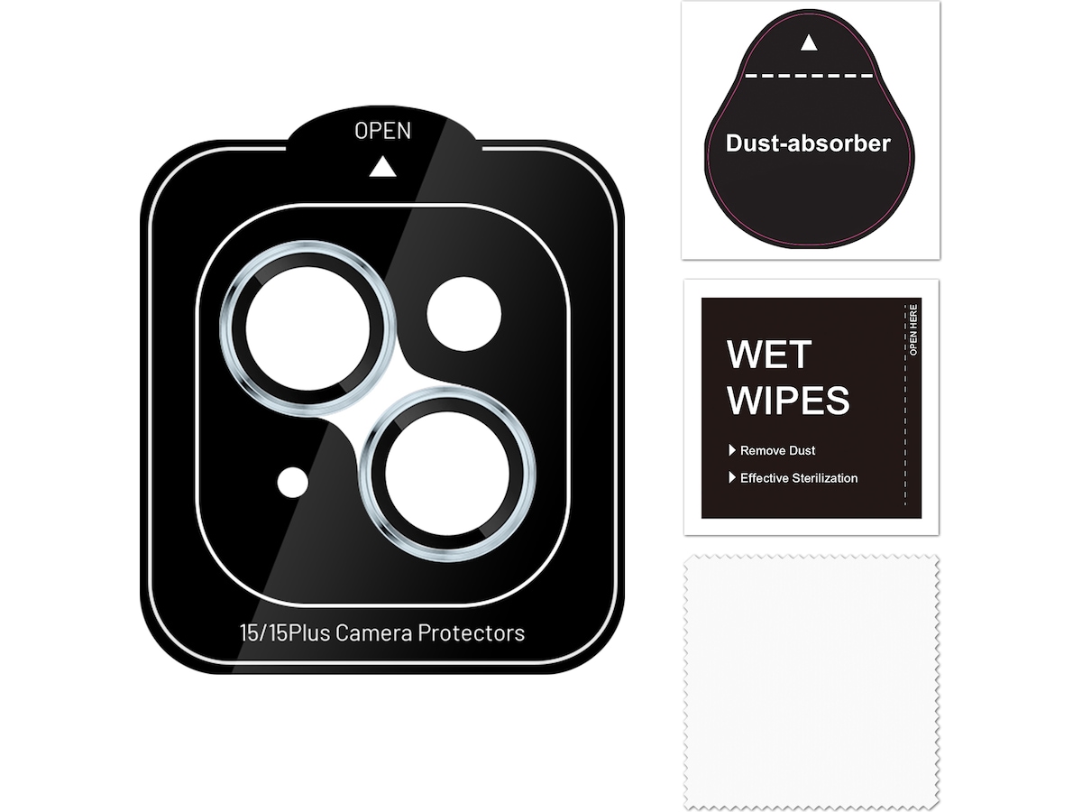 Kameralinsebeskyttere av 9H herdet glass. Ringene legger seg over kameralinsene, og beskytter mot skraper og støtskader.
