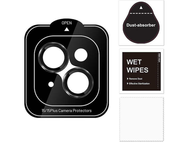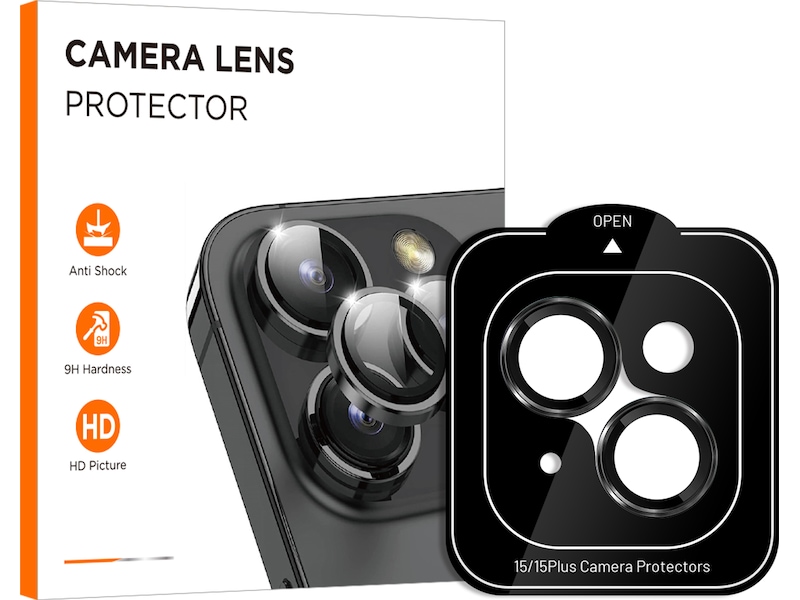 Kameralinsebeskyttere av 9H herdet glass. Ringene legger seg over kameralinsene, og beskytter mot skraper og støtskader.