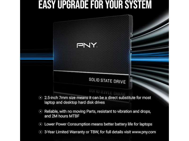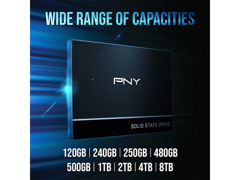 PNY CS900 er den ideelle løsningen for en ordinær SSD-oppgradering fra en harddisk (HDD). CS900 har alle de mest ettertraktede funksjonene til en utmerket verdi, og er utformet for en enkel og kostnadseffektiv utskiftning av harddisken i PC-systemet for å oppnå raskere oppstartstider, raskere applikasjonslanseringer og bedre systemytelse. Uten bevegelige deler er PNY CS900 svært slitesterk, har mindre risiko for svikt, og har 3 års begrenset garanti eller TBW