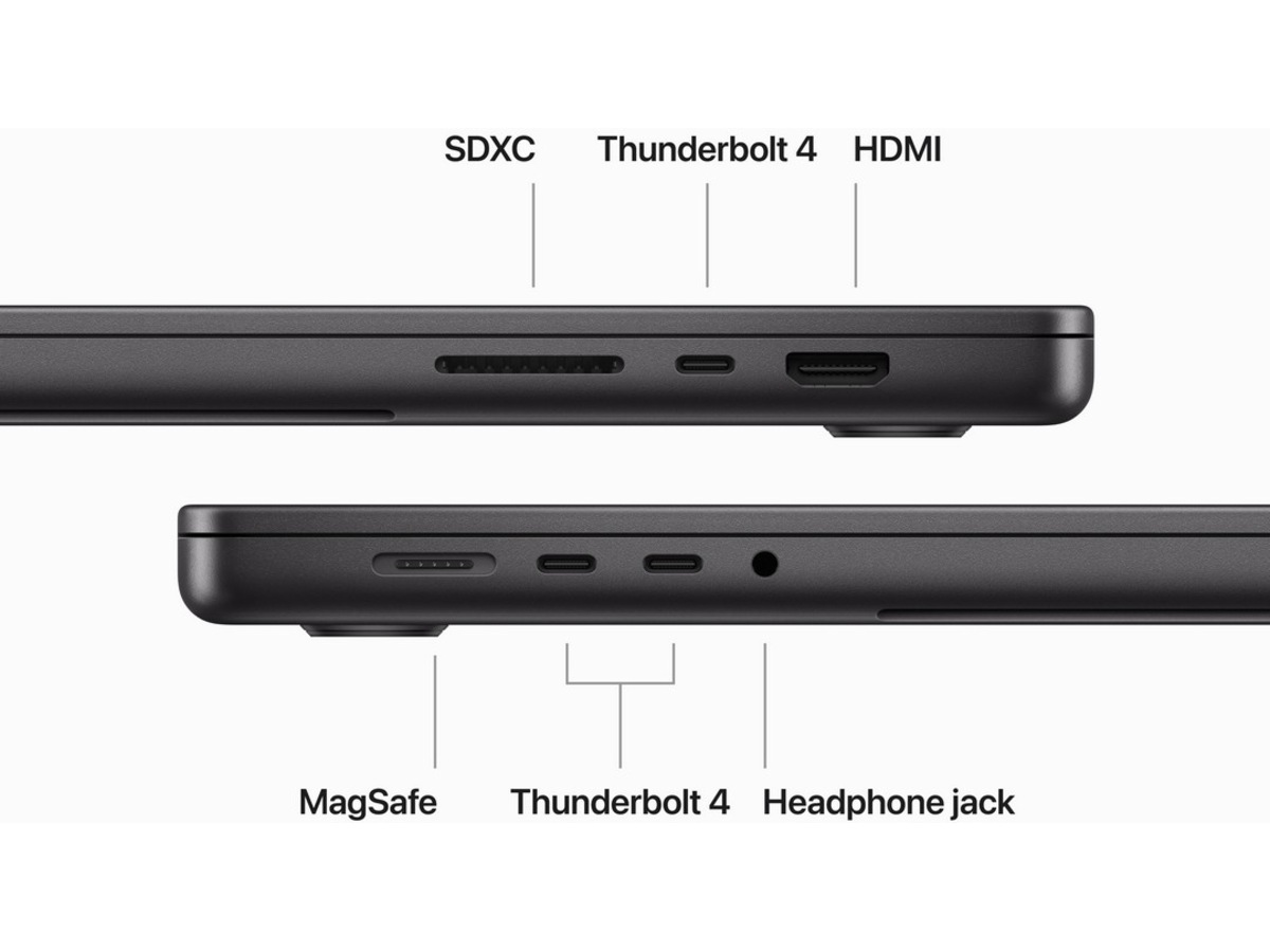- KOBLE TIL ALT – Denne MacBook Pro har MagSafe-ladeport, tre Thunderbolt 4-porter, en SDXC-kortplass, en HDMI-port og en hodetelefonutgang. Få rask trådløs tilkobling med WiFi 6E (5) og Bluetooth 5.3. Og du kan koble til opptil to eksterne skjermer med M3 Pro, eller opptil fire med M3 Max.