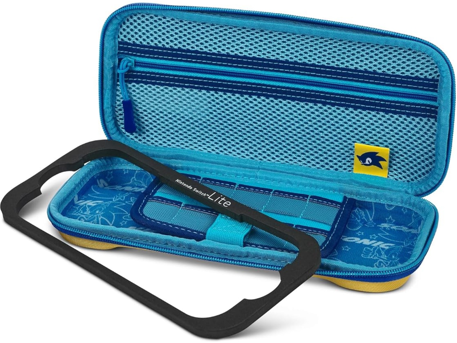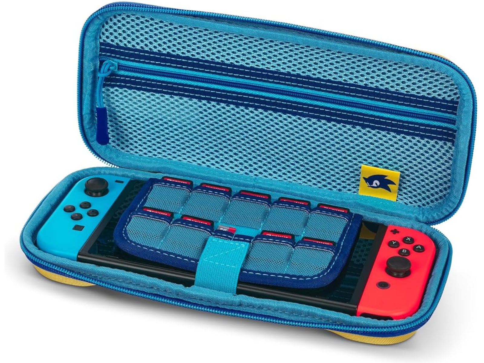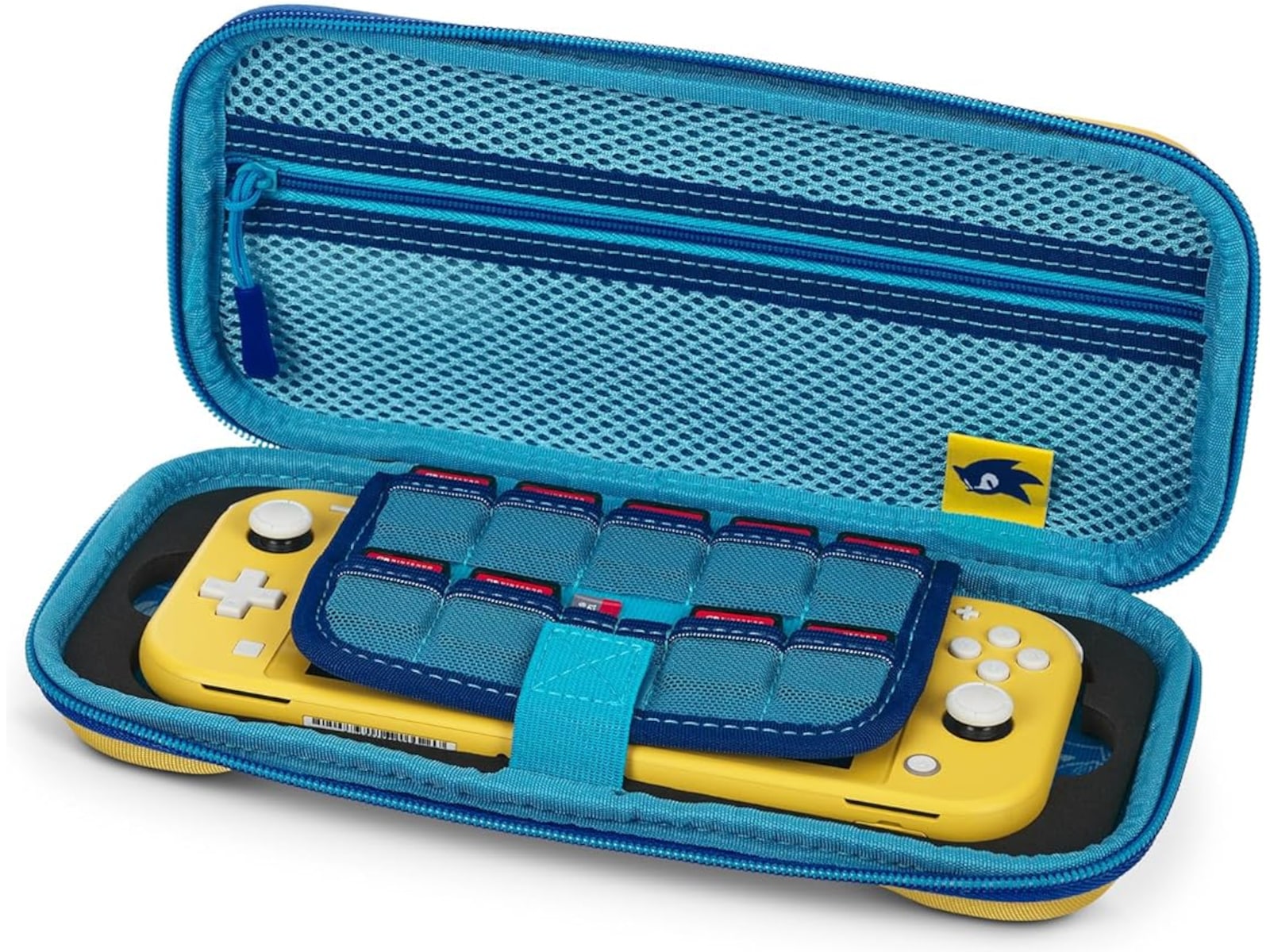 Oppbevar Nintendo Switch OLED-modell, Nintendo Switch eller Switch Lite med et solid ytre skall, gummiert håndtak, en støpt innside med filtfôr og en oppbevaringsdel i netting med glidelås.