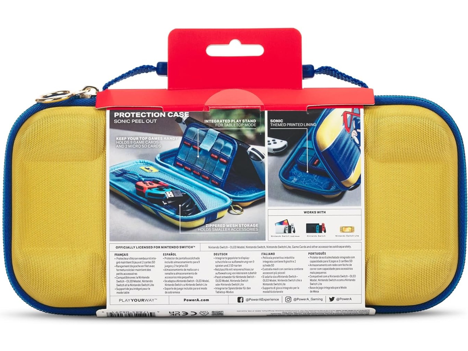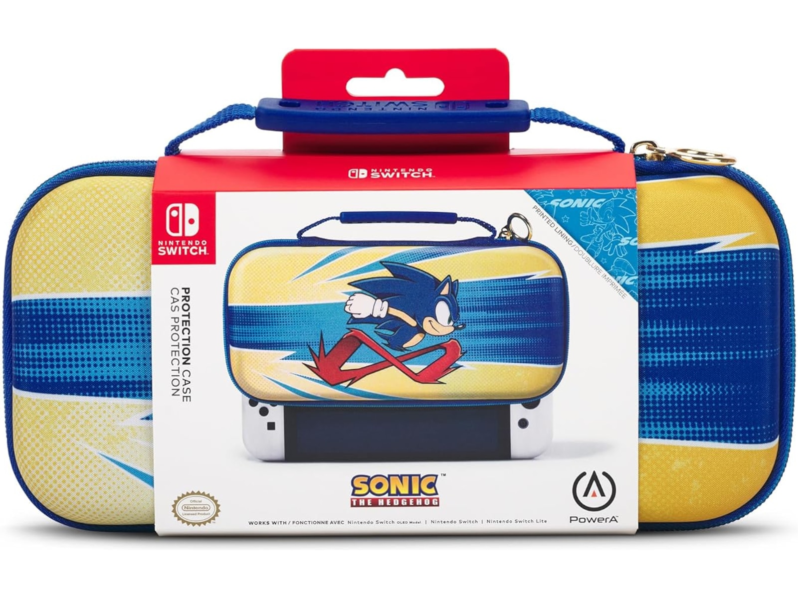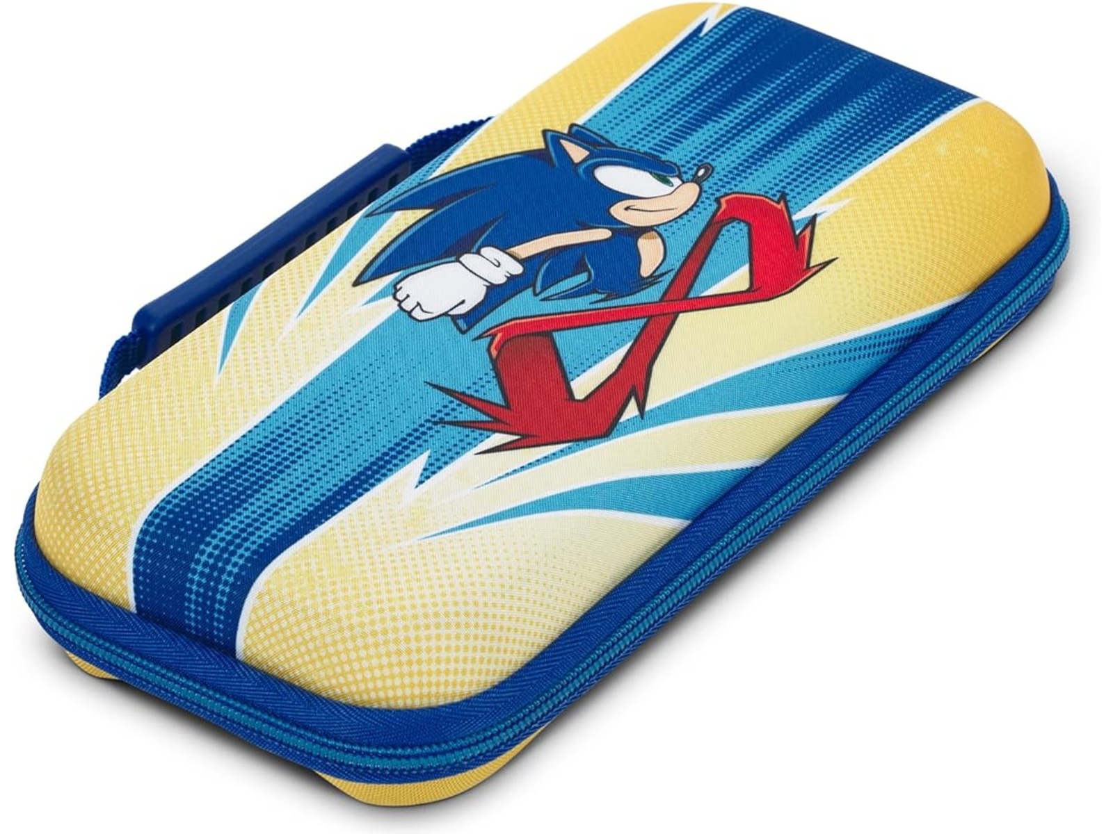 Oppbevar Nintendo Switch OLED-modell, Nintendo Switch eller Switch Lite med et solid ytre skall, gummiert håndtak, en støpt innside med filtfôr og en oppbevaringsdel i netting med glidelås.