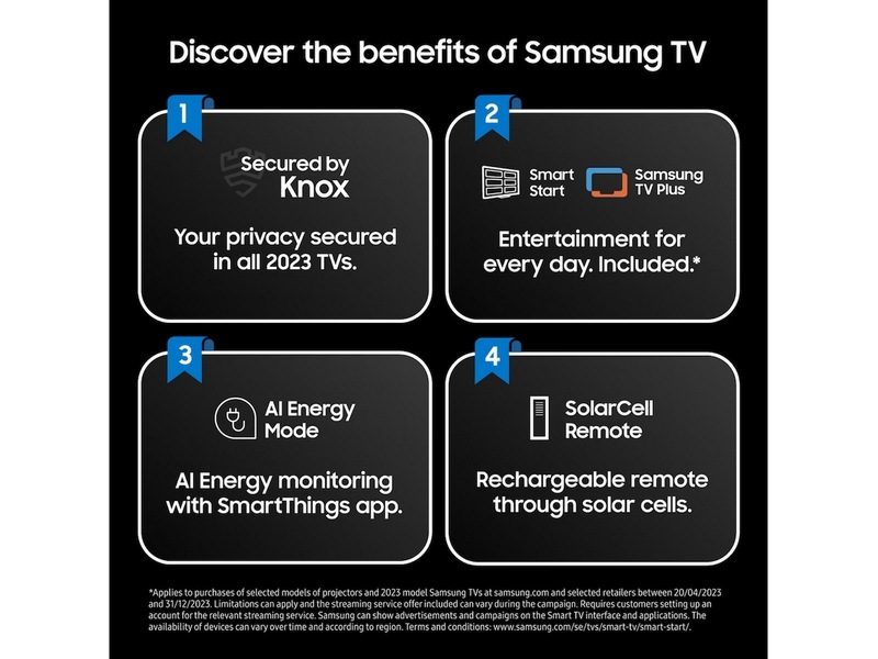 *Gjelder ved kjøp av utvalgte 2023 Samsung TV hos Samsung.com samt utvalgte forhandlere. Garantien gjelder i 10 år fra kjøpsdato. Krever en kopi av kvittering samt registrering på Samsungs nettsted innen 90 dager etter kjøp. Gjelder ved kjøp av utvalgte TV-modeller for 2023 til og med 31. mars 2024.