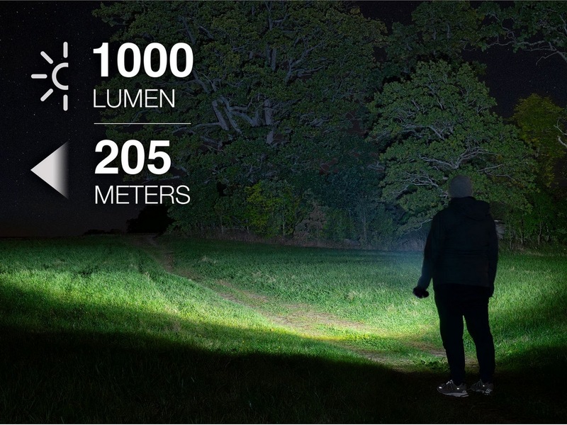 Den har justerbar lyskjegle med et avansert fokussystem som gir et jevnt lysbilde over hele fokusområdet. Lyspæren er en XP-L Cree Hvit LED pære som gir opp til 1000 Lumen.