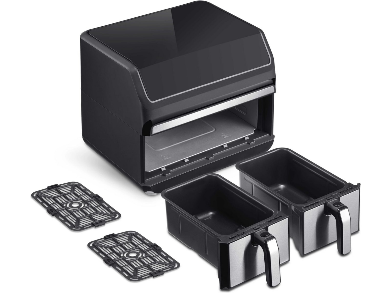 Denne frityrkokeren er utstyrt med to kurver som gjør det enkelt å tilberede to ulike retter samtidig, hver med individuelle temperatur- og tidsinnstillinger.