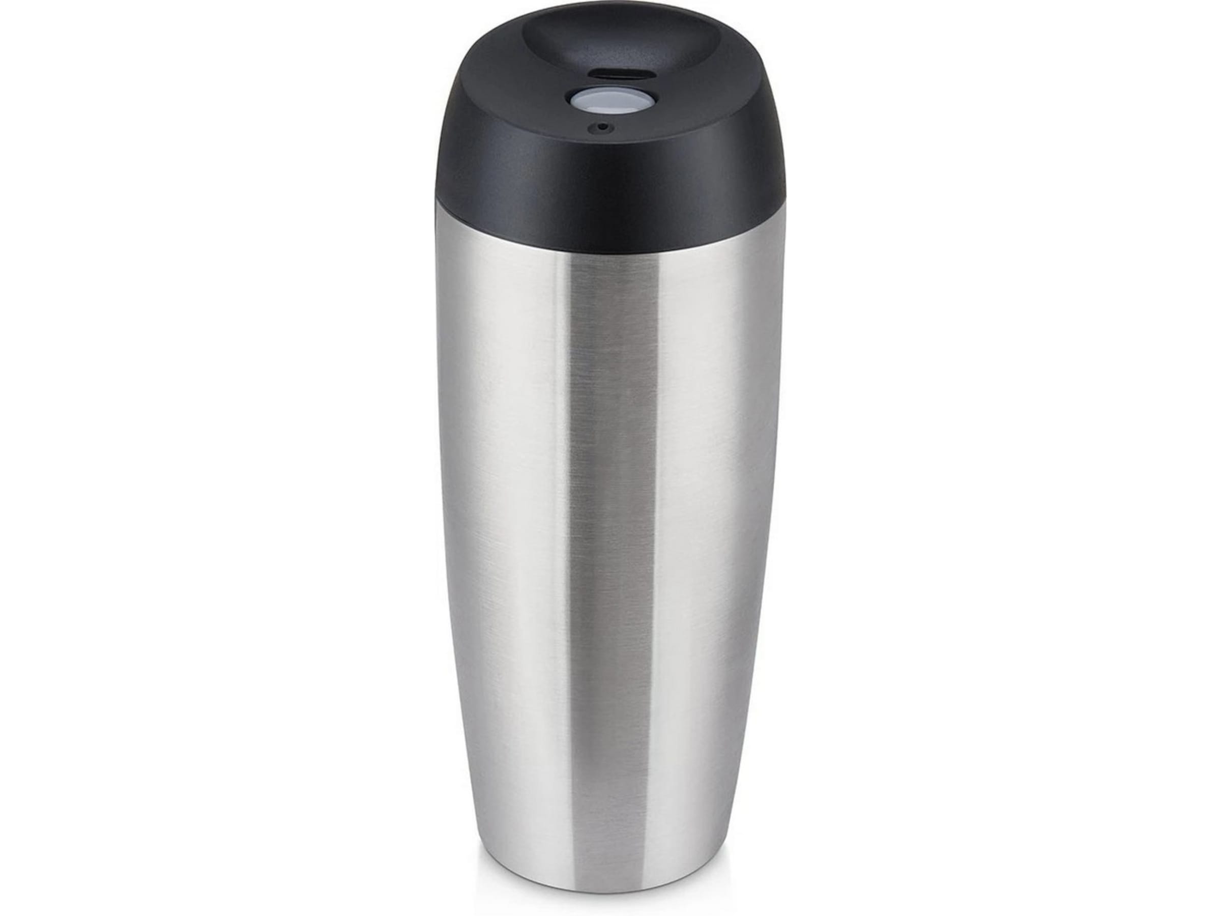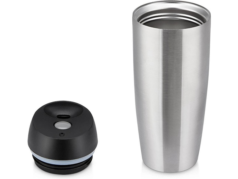 Den medfølgende termokoppen er laget av tolags rustfritt stål og har et plastlokk med varmebestandig beskyttelse. Dette gjør den ideell for å ta med kaffen din og nyte den underveis, enten det er i bilen, på bussen, eller på vei til jobb eller skole.