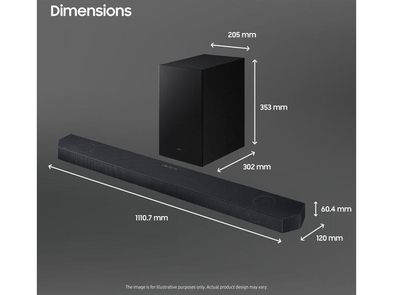 Lydbjelke: 111.07 cm x 12 cm x 6.04 cm / 4.8 kg, Subwoofer: 20.5 cm x 30.2 cm x 35.3 cm / 5.9 kg