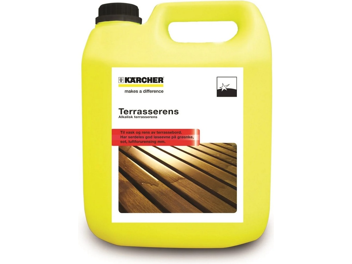 Kärcher terrasserens er et effektivt og hurtigvirkende rengjøringsmiddel for rengjøring av trykkimpregnert terrassegulv, trepanel, brygger og hagemøbler av tre. Terrasserensen har svært god løseevne på sot, grønske, luftforurensning, olje og annen vanskelig smuss. 4 liter.
