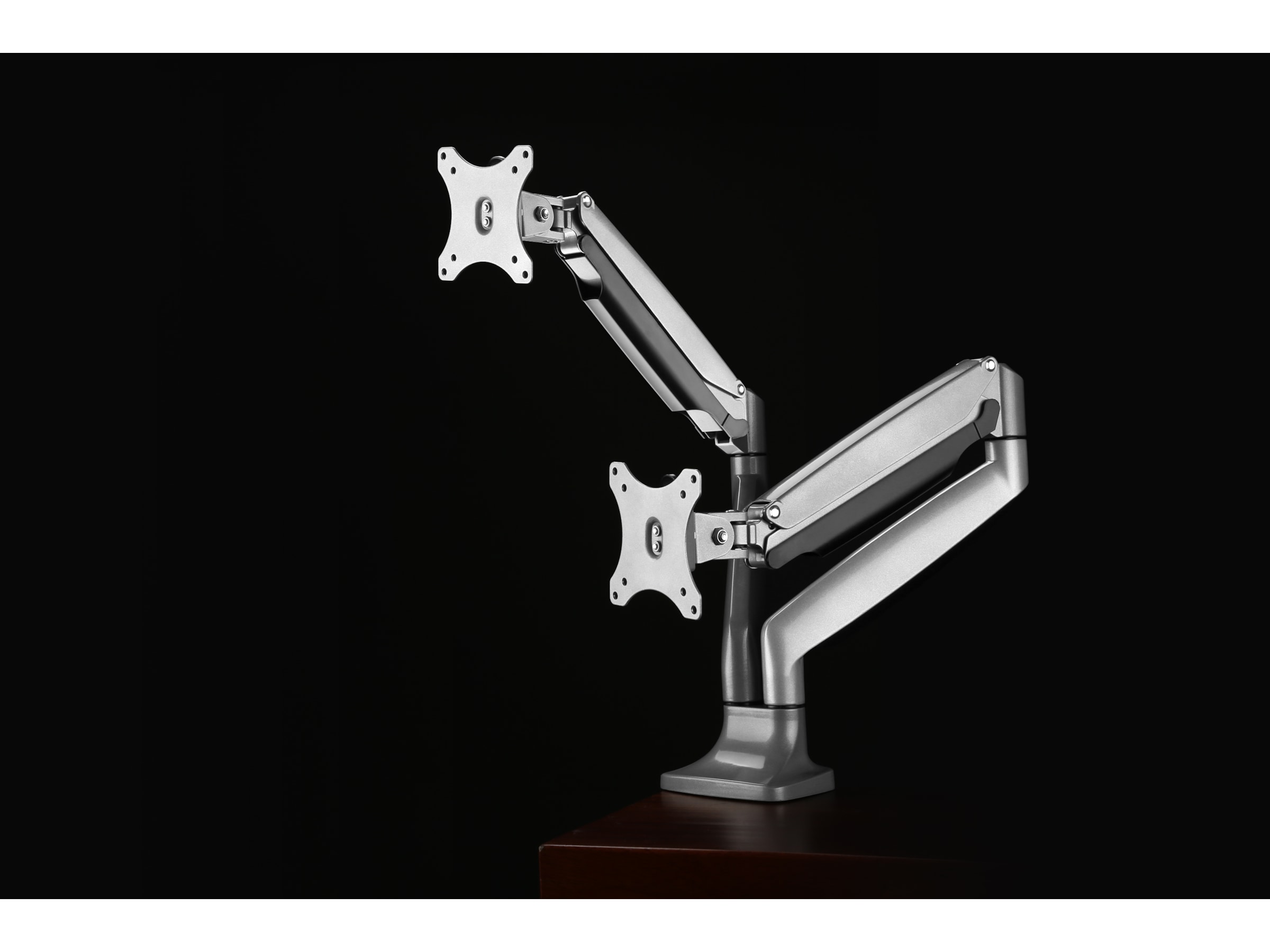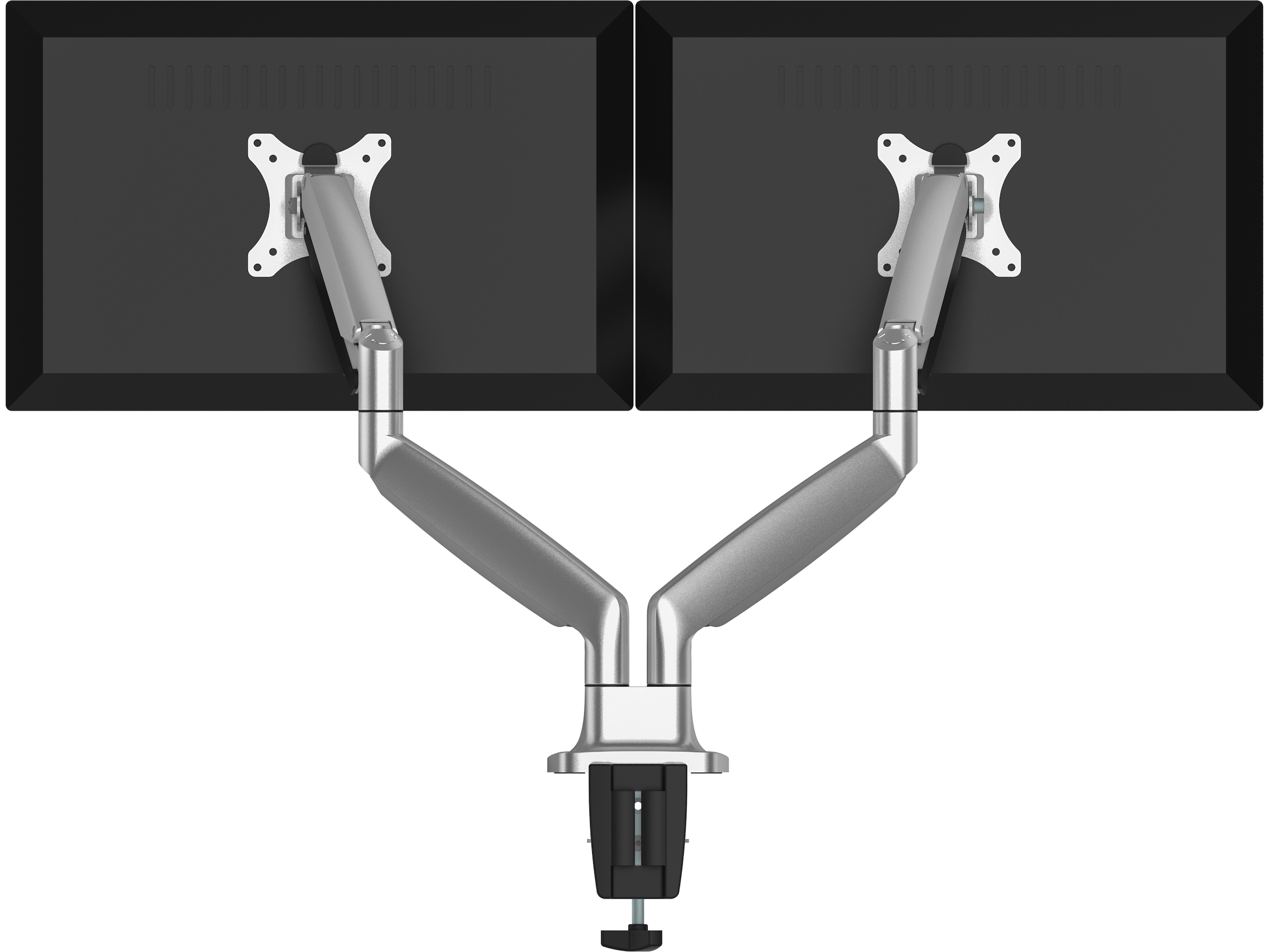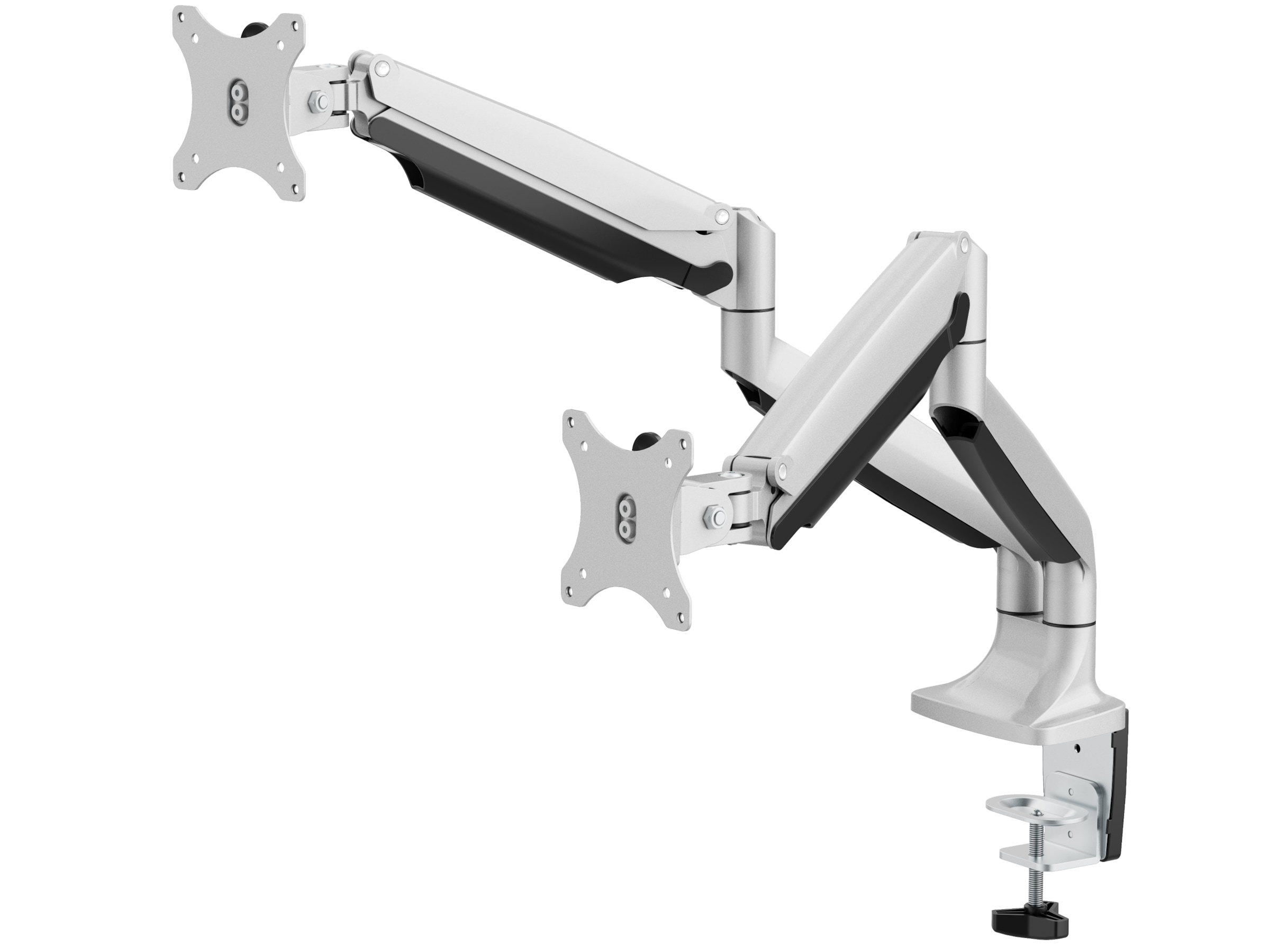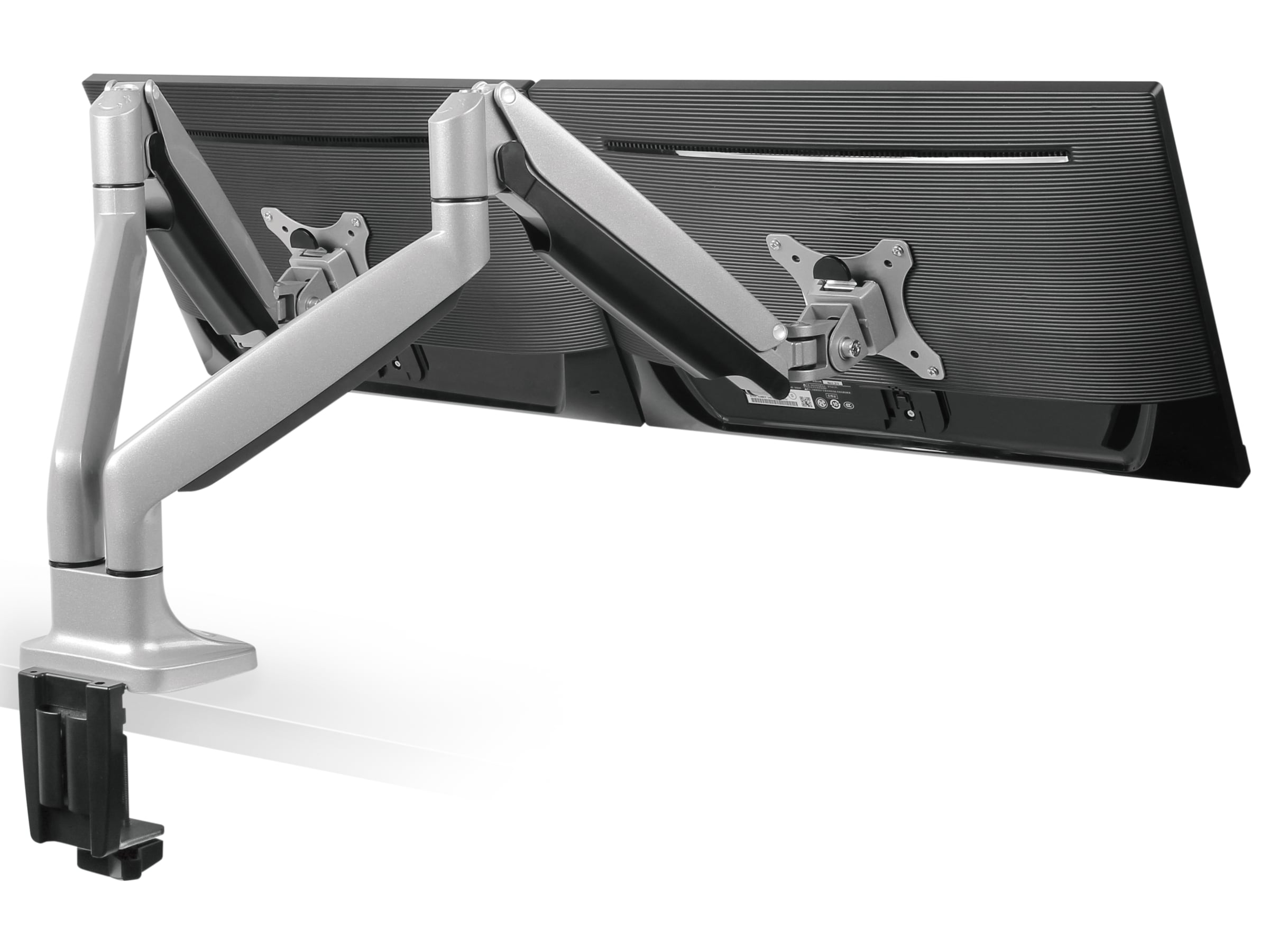 Monitorarmene er utstyrt med en gassfjær og tilbyr en rekke justeringsmuligheter for å redusere tretthet i nakke og øyne og finne en komfortabel arbeidsstilling. Du kan rotere hver skjerm opptil 90 grader i begge retninger, svinge dem opp til 90 grader til hver side og vippe dem opp til 90 grader opp eller ned. Enten du har flate eller buede skjermer, passer denne monitorarmen begge typer.