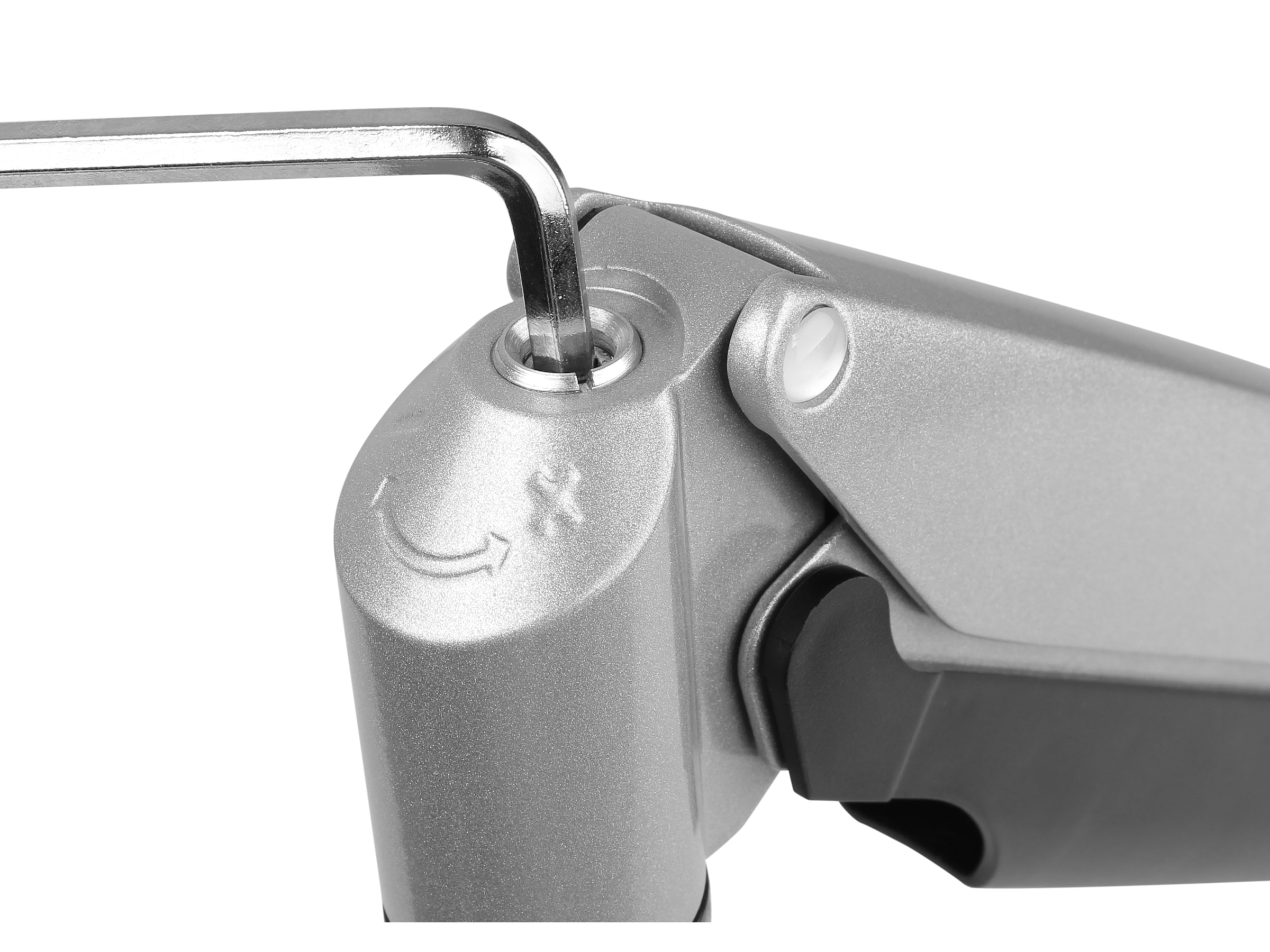 Monitorarmene er forhåndsinnstilt med den laveste vektkapasiteten under produksjonen, og du må derfor justere fjærspenningen med den medfølgende unbrakonøkkelen når skjermen er montert, for at skjermen skal sitte godt fast.