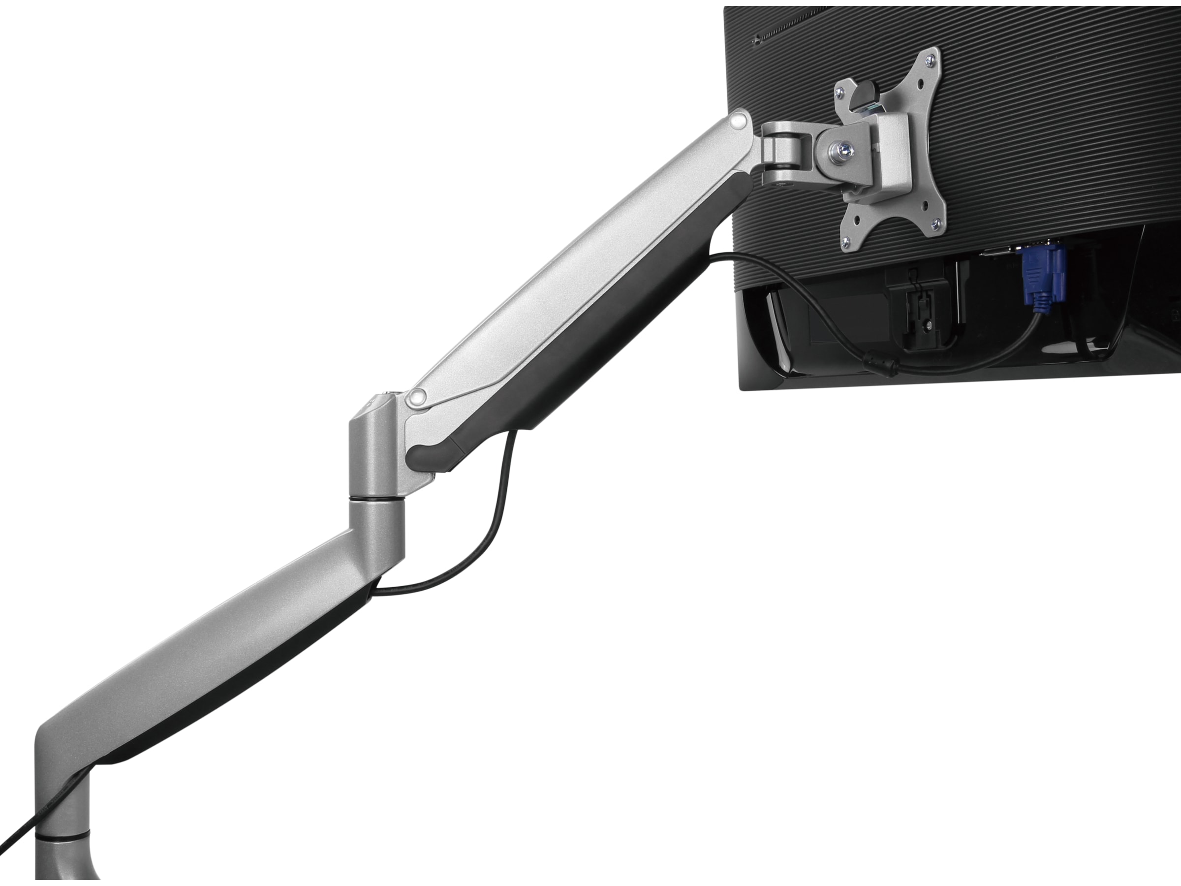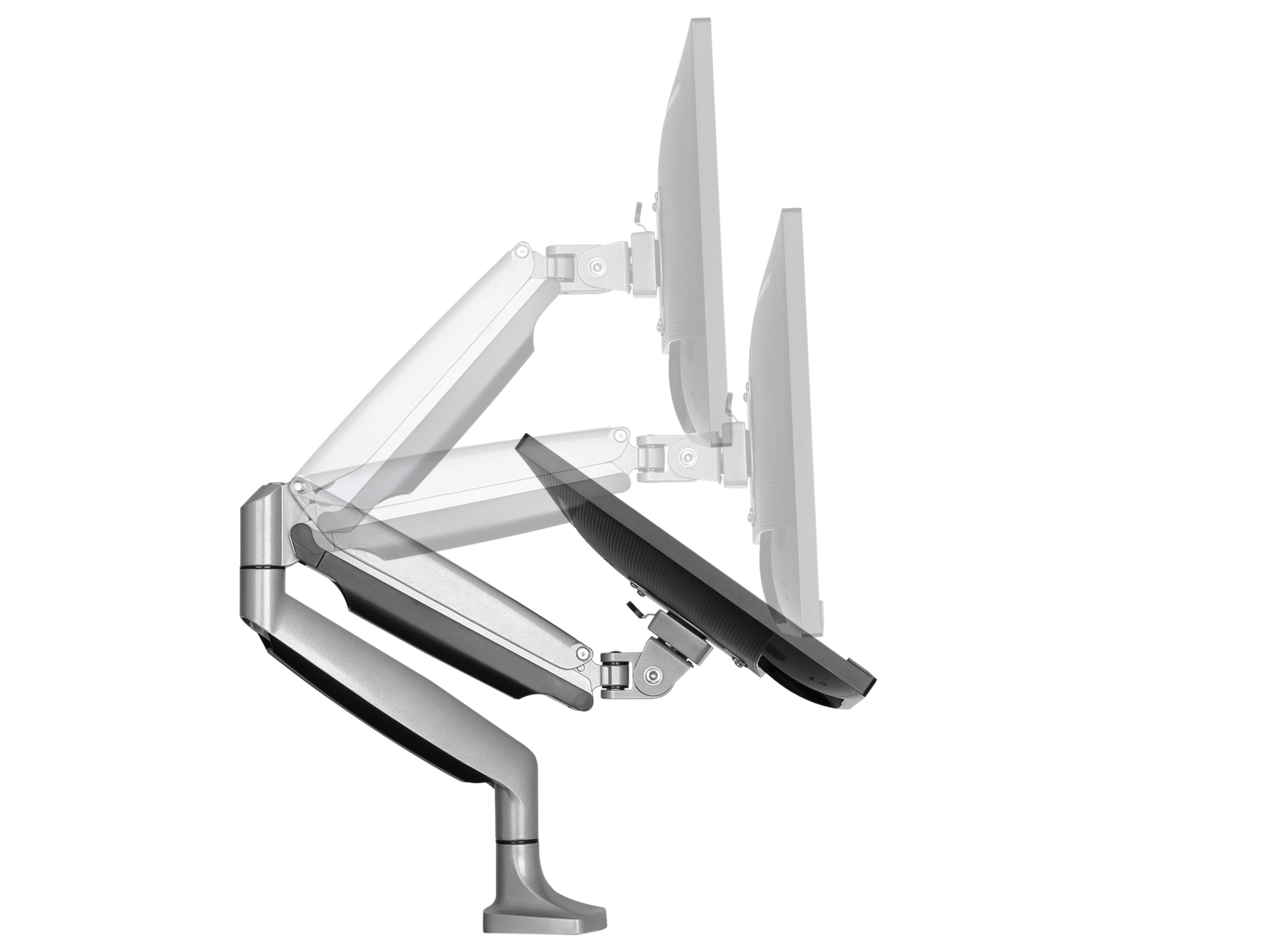 Monitorfestet er utstyrt med en gassfjær, og har et bredt spekter av justeringsmuligheter for å redusere tretthet i nakke og øyne og finne en komfortabel arbeidsstilling. Du kan rotere hver skjerm opptil 90 grader begge veier, svinge dem opptil 90 grader til hver side og vippe dem opptil 90 grader opp eller ned. Enten du har flate eller buede skjermer, passer denne monitorarmen til begge typer.