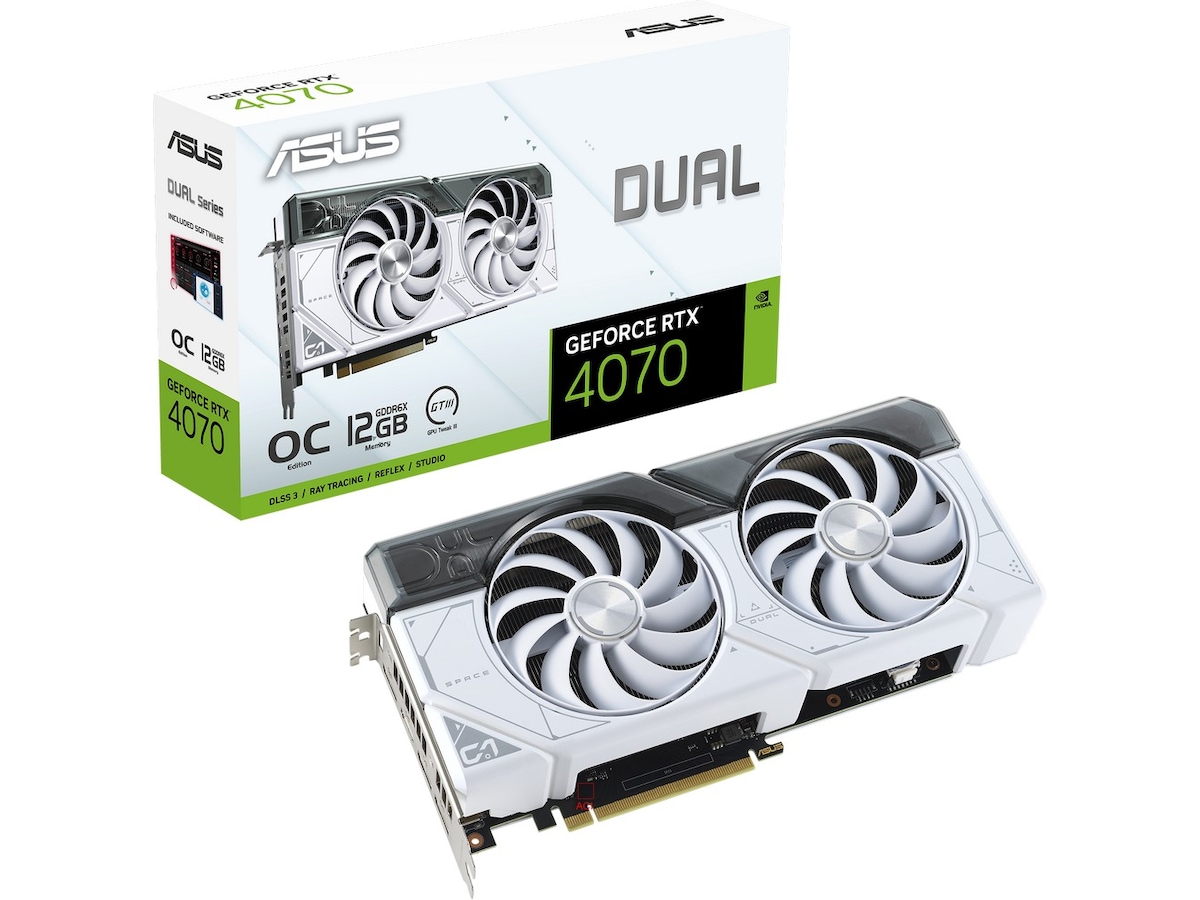 ASUS DUAL Geforce RTX 4070 SUPER ASUS Dual GeForce RTX™ 4070 SUPER White Edition 12GB GDDR6X with two powerful Axial-tech fans and a 2.56-slot design for broad compatibility