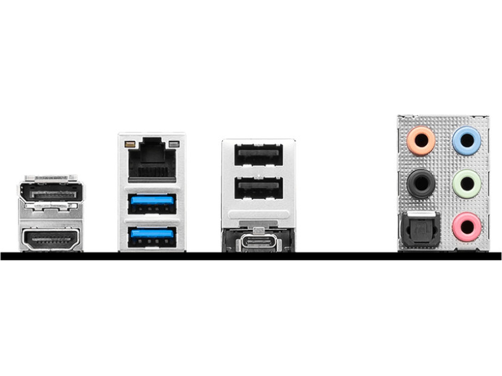 2 x USB 3.2 Gen 1, 1 x USB-C 3.2 Gen 2, 2 x USB 2.0, 1 x lydutlinje (bakre) - minijakk, 1 x lydutlinje - minijakk, 1 x lydutlinje (senter/subbasshøyttaler) - minijakk, 1 x HDMI, 1 x mikrofon - minijakk, 1 x DisplayPort, 1 x lydinnlinje - minijakk, 1 x SPDIF-utgang, 1 x LAN (2.5Gigabit Ethernet) |