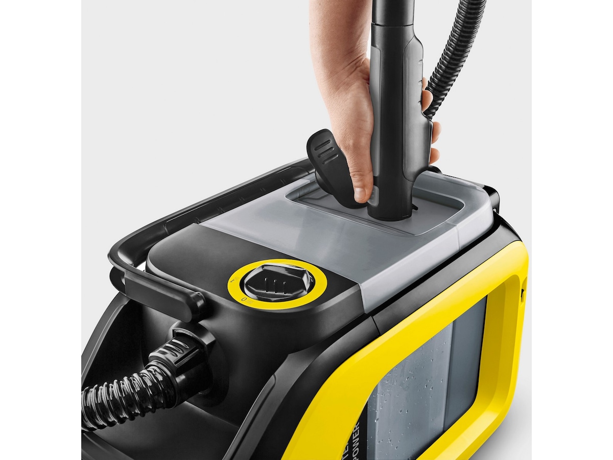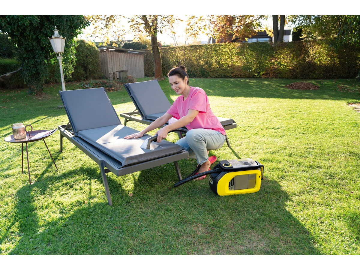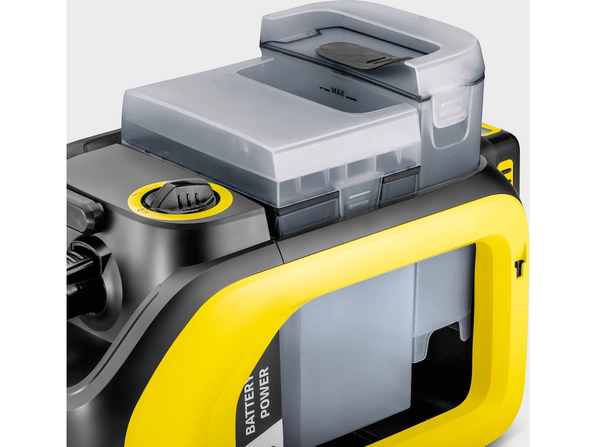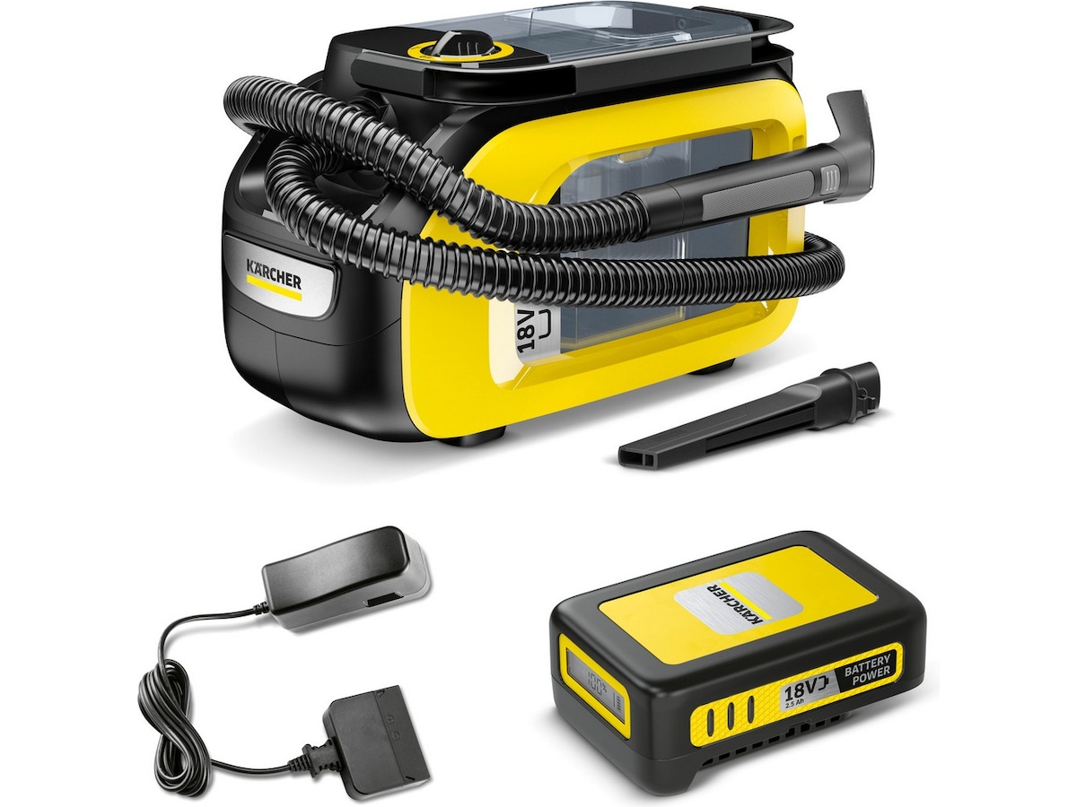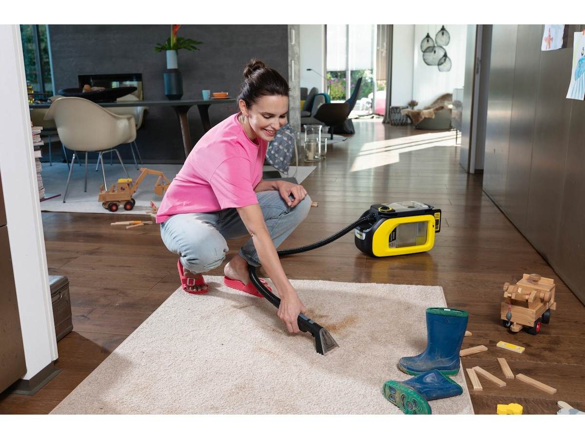 Takket være den kompakte designen er enheten ikke bare hendig, men kan også brukes når det ikke er noe strømuttak i nærheten, på grunn av Kärcher 18 V -batteriet. Dette gjør det mulig å rengjøre for eksempel bilens interiør på bare 12 til 24 minutter. Du fjerner dermed smuss fra bilseter, gulvmatter og bagasjerommet samt hagemøbler og møbeltrekk på et øyeblikk - like kraftig som våre støvsugere med ledning.