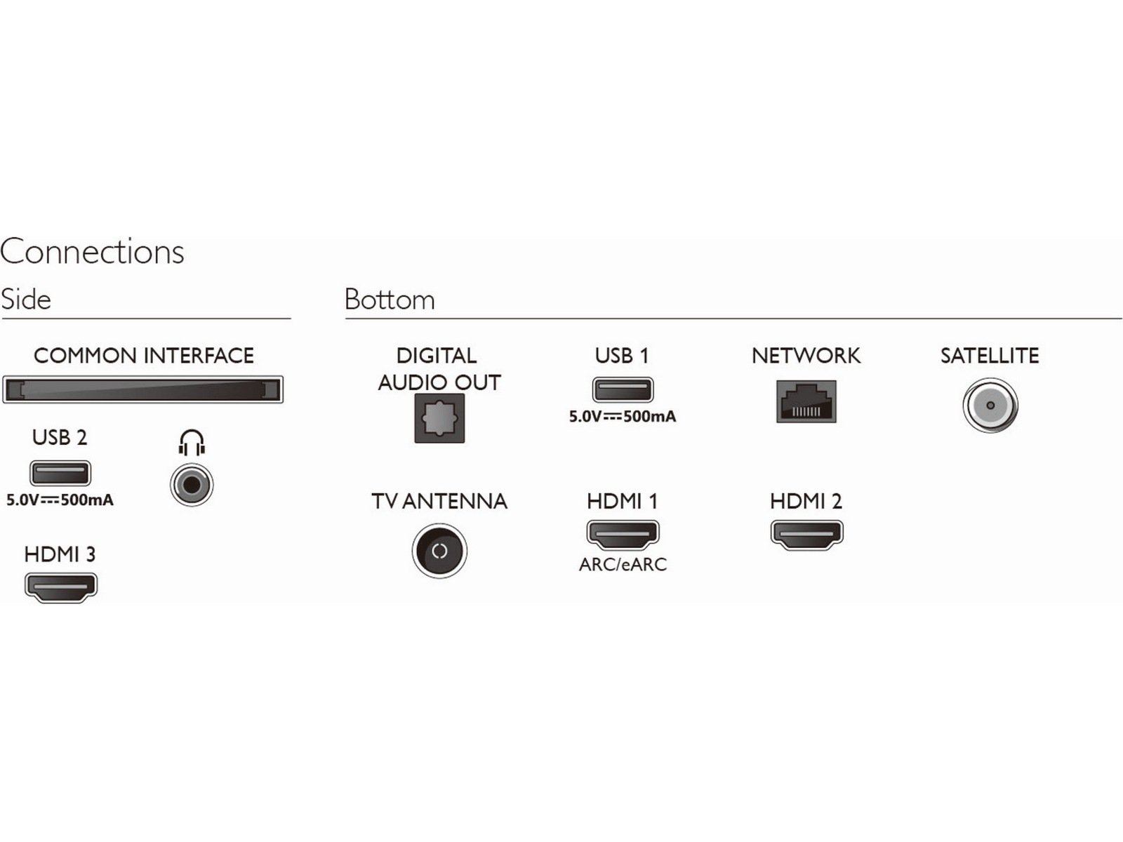 Hodetelefoner - side, USB - bunn, HDMI - side, Digital lydutgang (optisk) - bunn, LAN - bunn, 2 x HDMI - bunn, USB - side