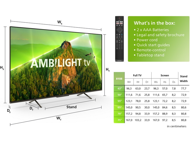 Panel med stativ - 96.3 cm x 23.7 cm x 63 cm x 8.8 kg, Panel uten stativ - 96.3 cm x 7.7 cm x 55.7 cm x 8.5 kg, Stativ - 77.7 cm x 23.7 cm x 7.2 cm