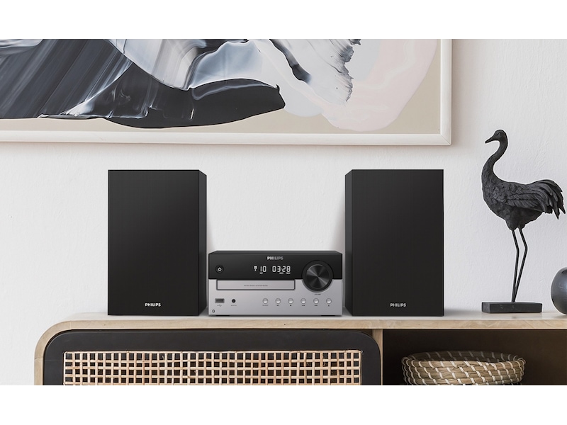 Med dette mikroanlegget med klassisk utseende kan du strømme musikk og podkaster, spille av CD-er og høre på FM-radio – alt med fyldig lyd på 60 W. Det er perfekt for en stue eller åpen planløsning, og du kan koble til andre kilder via USB eller lydinngang.