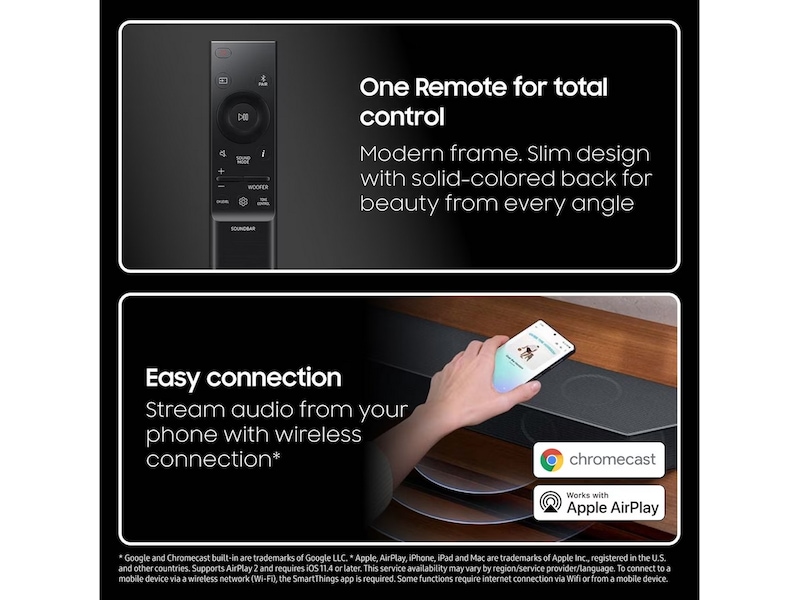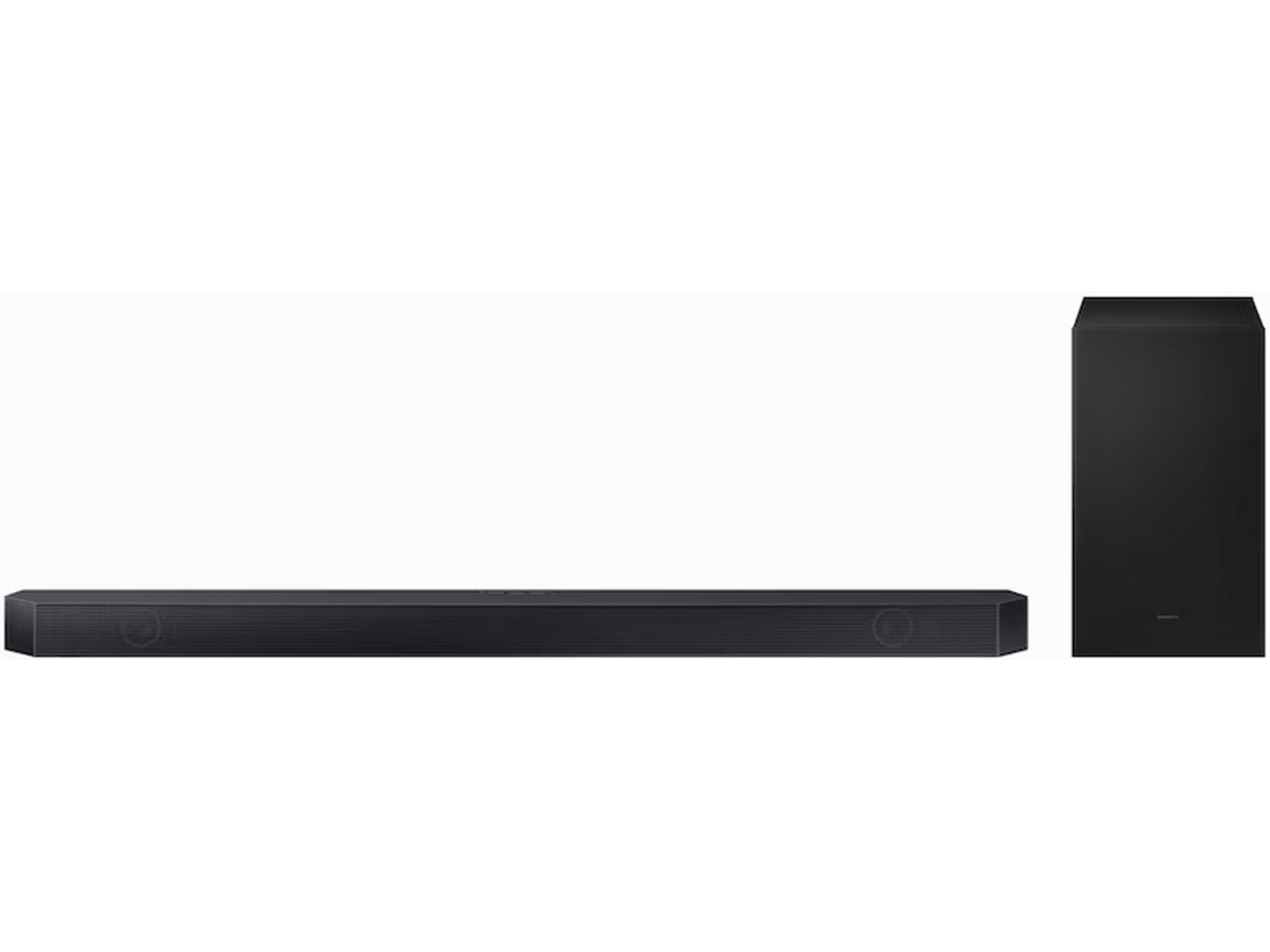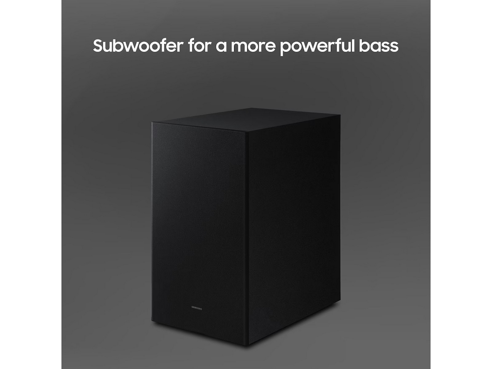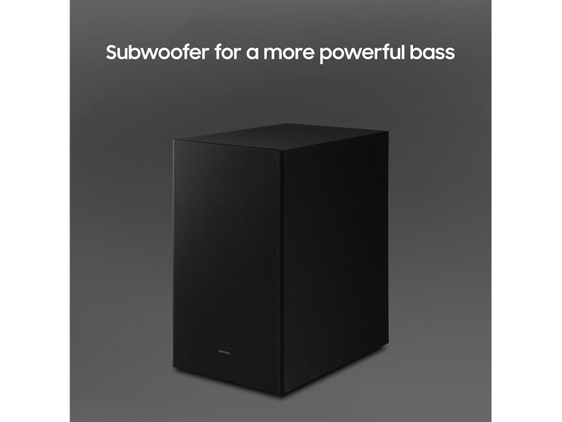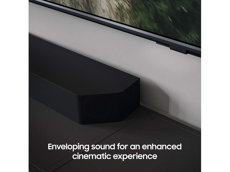 Samsungs soundbar kalibrerer lyden på bakgrunn av en analyse av rommet fra Samsung TV, noe som gir en klar og omsluttende lyd som er skreddersydd for rommet.