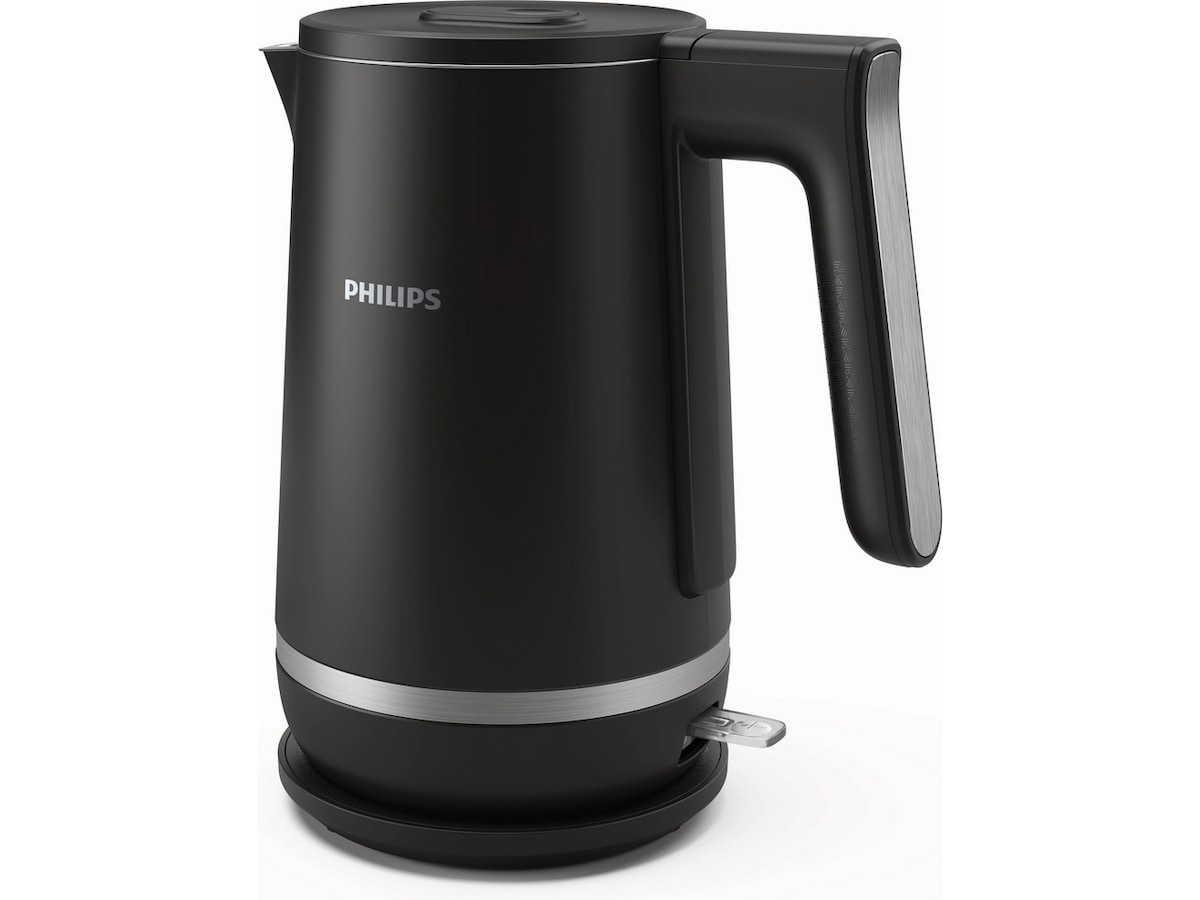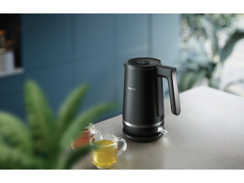 Du trenger ikke å vente på at vannkokerens utside er avkjølt. Vår dobbeltveggede vannkoker har et isolerende lag som sikrer et kjølig utside samtidig som vannet holder seg på innsiden i lengre perioder.