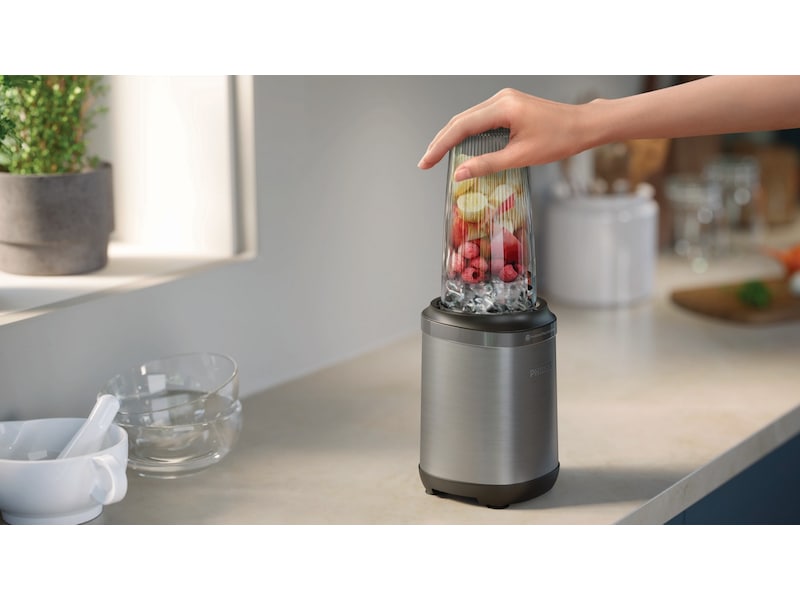 Bland og ta med den praktiske 700 ml beholderen. Lag din daglige smoothie, og sett deretter på et lekkasjesikkert lokk for å ta den med deg. Oppbevar den i kjøleskapet til senere. Beholderen er laget med Tritan fra Eastman, den er 100 % BPA-fri, knusebestandig og tåler oppvaskmaskin.