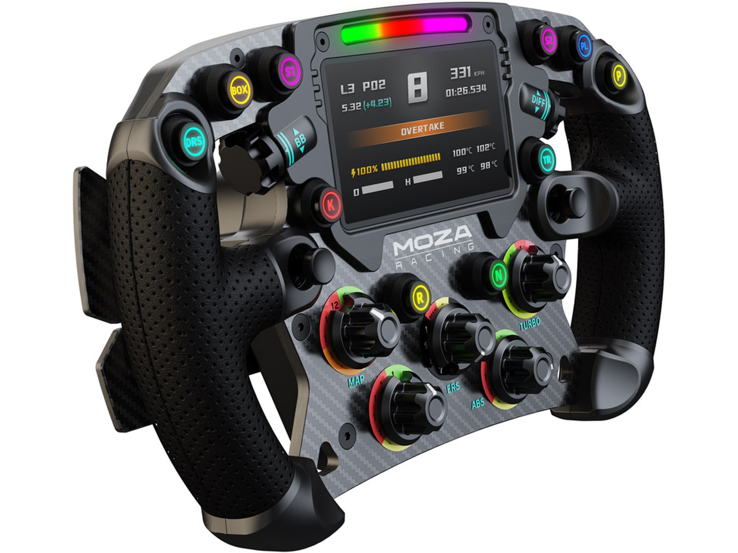 Et komfortabelt, men fast grep gir FSR-rattet en naturtro racingfølelse. Selv i møte med MOZAs R21-moment, har en sjåfør rask tilgang til alle justeringer de må foreta i kamp, med nøye plasserte styrespaker, knapper og brytere