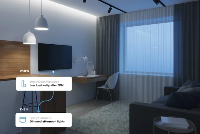 Ikke glipp det sterke lyset hjemme når været er mørkt og regnvær! Takket være LUX-sensoren kan Shelly Door/Window2 justeres for å følge det naturlige lyset utenfor og slå på lysene tidligere på regnværsdager, noe som sakte øker lysstyrken etter hvert som ettermiddagen blir til kveld.