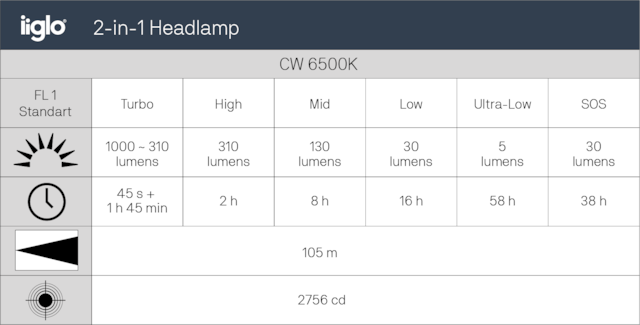 Hodelykten kan lades opp med UBS-C-kabel og er også kompatibel med et standard AA-batteri. Ved full oppladning kan iiglo hodelykt vare i bruk i opptil 58 timer ved lav styrke.