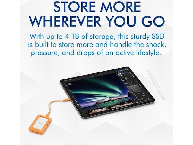 Slitesterk, rask og bærbar – LaCie Rugged Mini SSD tar prosjektet ditt fra opptak til sikkerhetskopiering på kort tid. Med fremtidssikker USB 40 Gbps og Thunderbolt 4-kompatibilitet vil filene dine flytte seg med lesehastigheter på opptil 2000 MB/s så lenge du har stasjonen. I tillegg ville den ikke vært robust hvis den ikke hadde vann-, støv- og fallmotstand, flott uansett hvor du velger å streife.