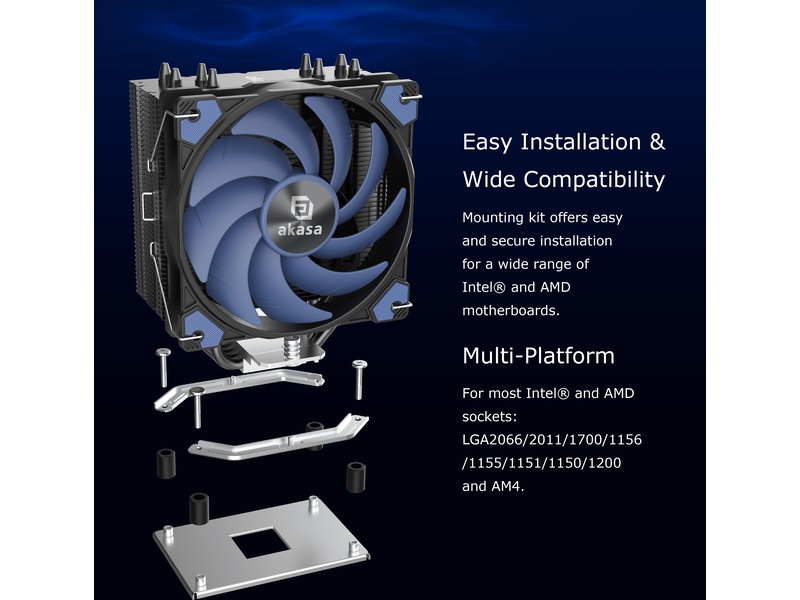 Alucia-vifte med avansert bladteknologi, intelligent PWM-synkronisert hastighetskontroll og dempende puter for å redusere vibrasjoner under drift. Premium BadgeMetallic Akasa-merket forsterker den førsteklasses følelsen og den totale estetikken