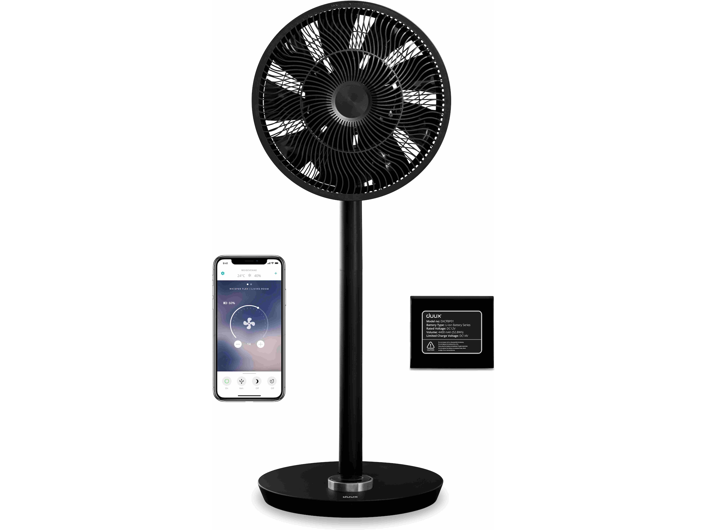 Det medfølgende forlengelsesrøret forvandler Whisper Flex fra en skrivebordsmodell (51 cm) til en gulvmodell (88 cm). Den kompatible dokken og batteripakken lar deg gjøre Whisper Flex om til en bærbar vifte. Batteriet har en levetid på opptil 18 timer, avhengig av innstillinger.