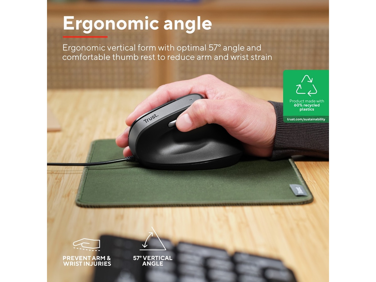 Ergonomisk mus med optimal vertikal vinkel for redusert belastning på håndleddet