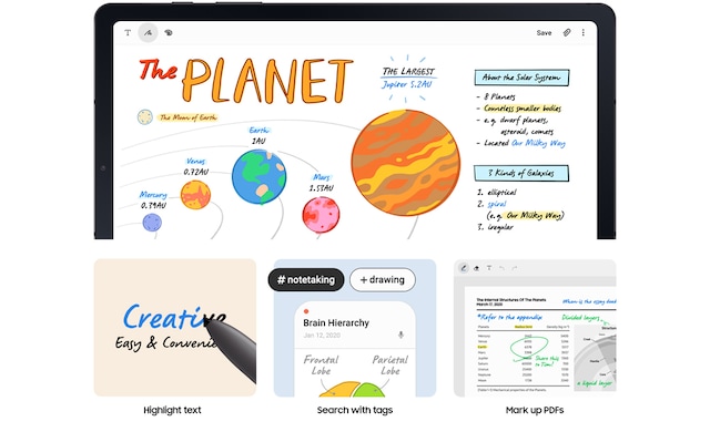 Med S Pen er det enkelt å ta notater under forelesninger. Du kan da skrive først og endre overstrykingsfargene etterpå. Bla raskt gjennom lagrede notater ved hjelp av søkbare tagger. Det er også mulig å skrive direkte i PDF-dokumenter for å gjøre alt mer oversiktlig. Og når tentamen nærmer seg, er du godt organisert og klar.