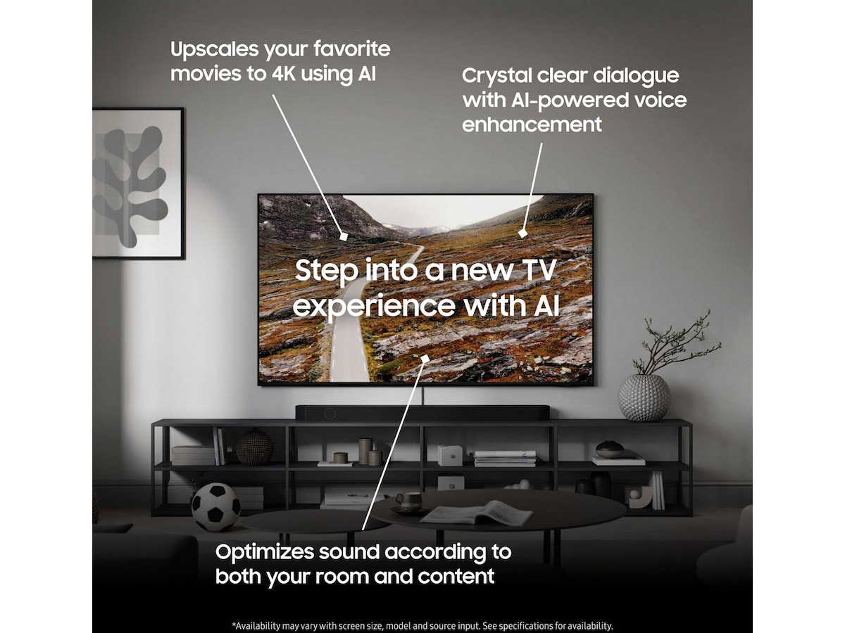 *Utvalget av apper og tjenester varierer over tid, siden gamle kan forsvinne og nye komme til. Noen tjenester og apper krever abonnement eller engangskjøp for å kunne brukes. Samsung kan vise reklame og kampanjer på Smart TV-grensesnittet og i applikasjoner. Skjermspeiling fungerer bare når TV og mobil er slått på og koblet til samme Wi-Fi-nettverk. Apple og AirPlay er varemerker for Apple Inc., registrert i USA samt andre land og regioner. AirPlay krever iOS 12.3 eller senere, eller macOS 10.14.5 eller senere.
