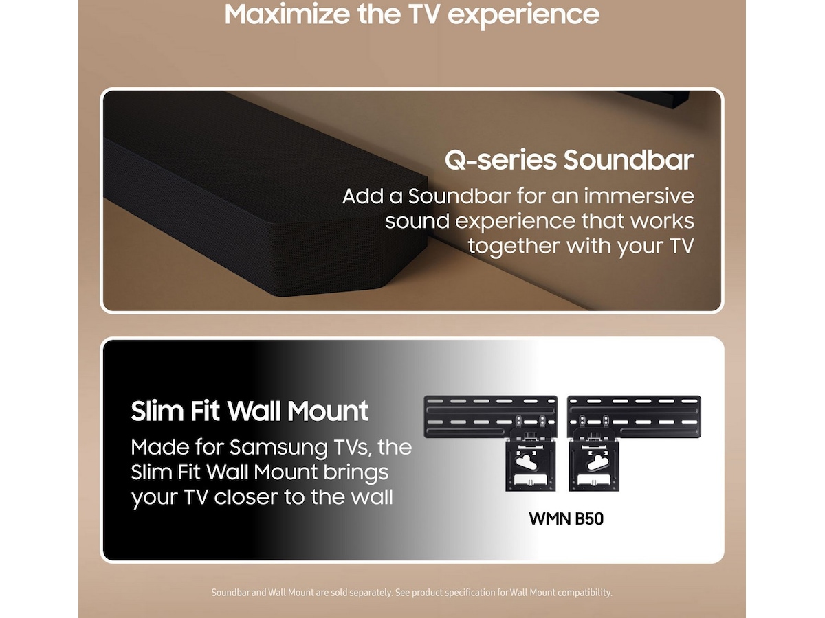 En TV-opplevelse som aldri før. Ved hjelp av kunstig intelligens analyserer og optimaliserer den nye prosessoren innholdet for et sylskarpt bilde og krystallklar lyd. Speileffekten på stativet skaper en optisk effekt som får det til å se ut som om skjermen svever i luften. Den luksuriøse metallkanten er kun 12,9 mm tynn.