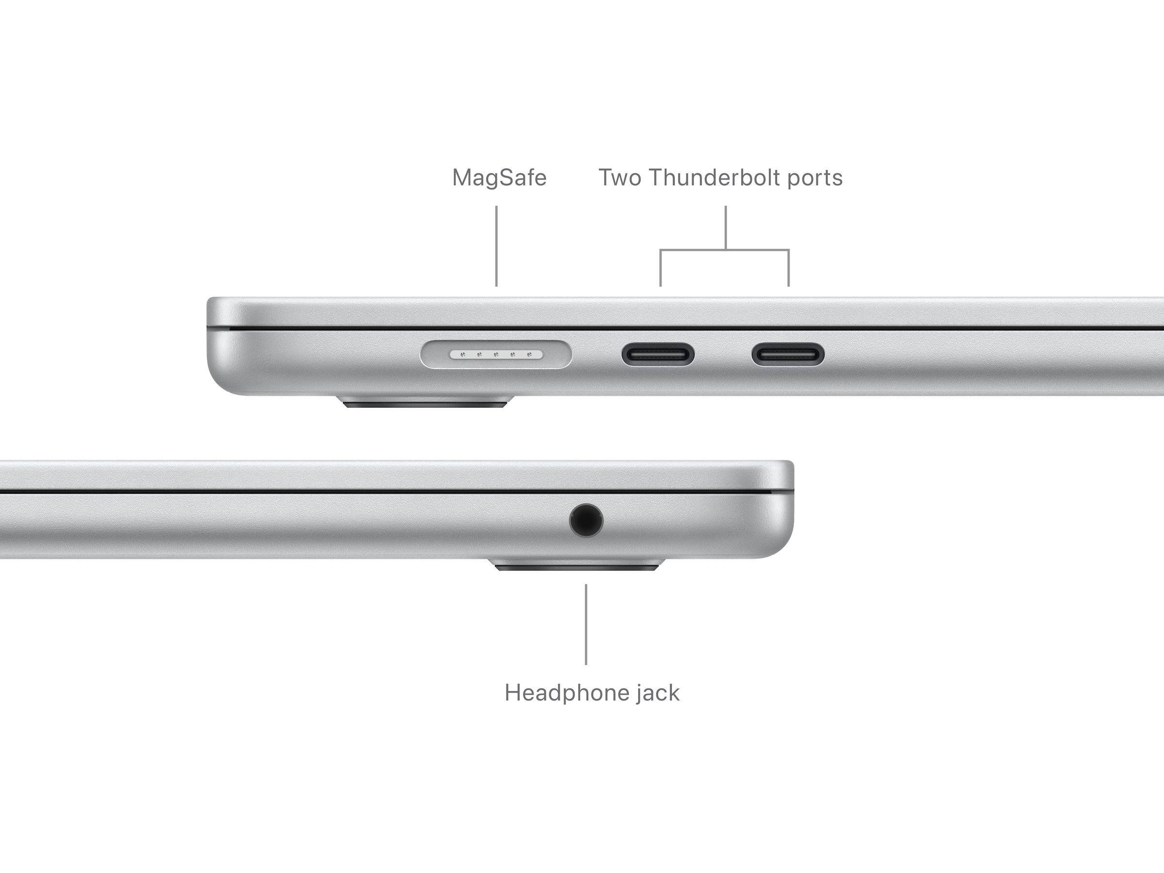 • FULLKONTAKT – MacBook Air har to Thunderbolt-porter, en hodetelefonutgang, wifi 6E,(4) Bluetooth 5.3 og en MagSafe-ladeport. Koble til opptil to eksterne skjermer med maskinen lukket.