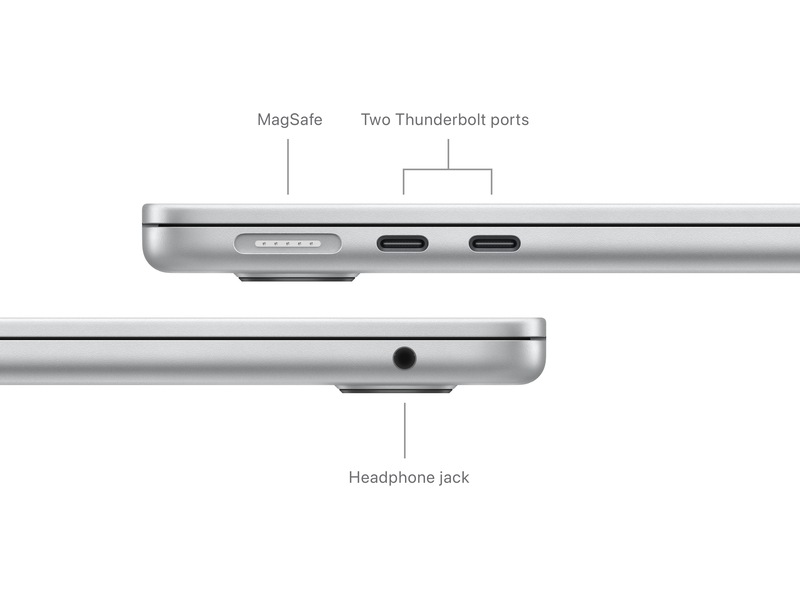 • FULLKONTAKT – MacBook Air har to Thunderbolt-porter, en hodetelefonutgang, wifi 6E,(4) Bluetooth 5.3 og en MagSafe-ladeport. Koble til opptil to eksterne skjermer med maskinen lukket.