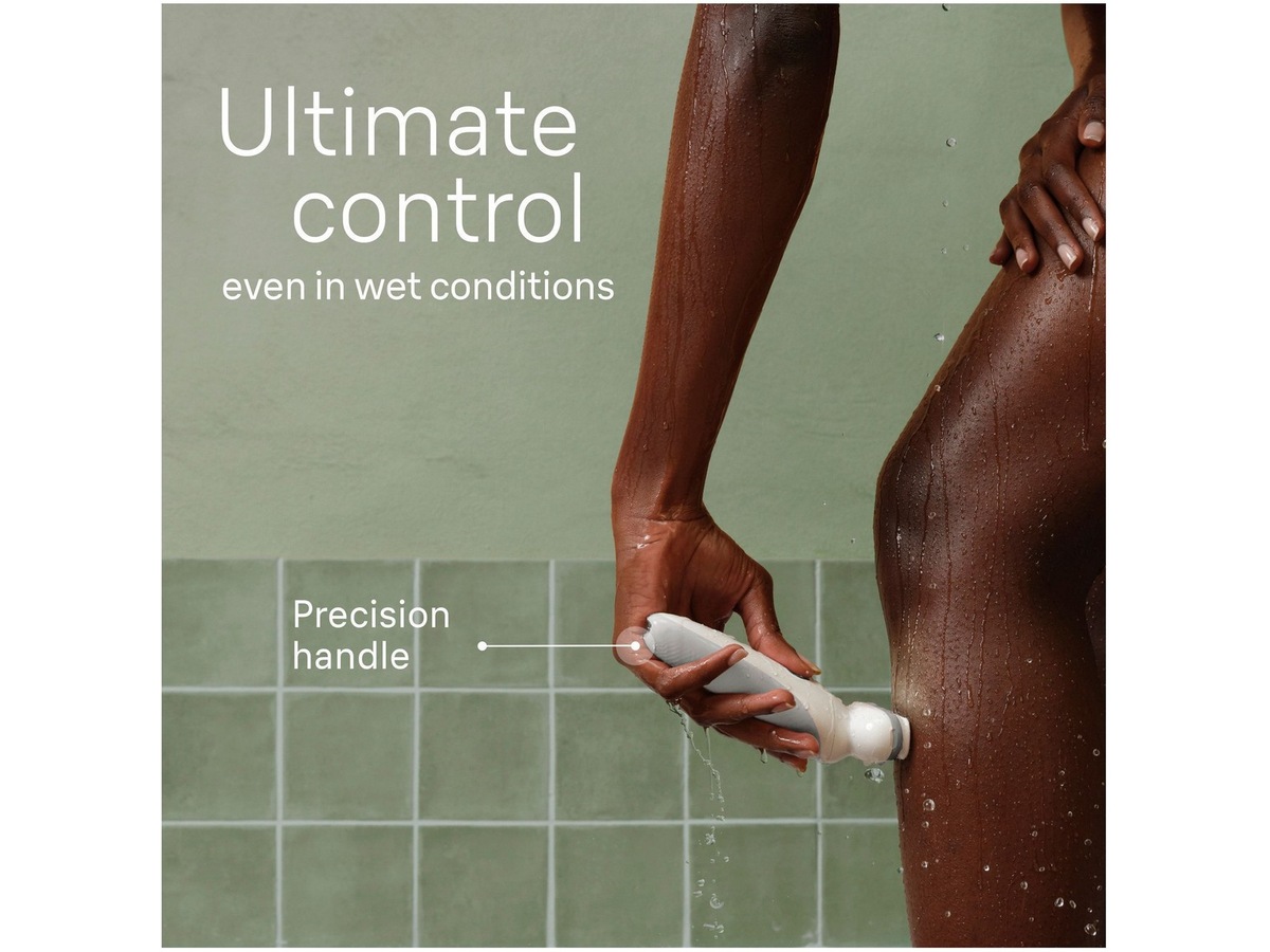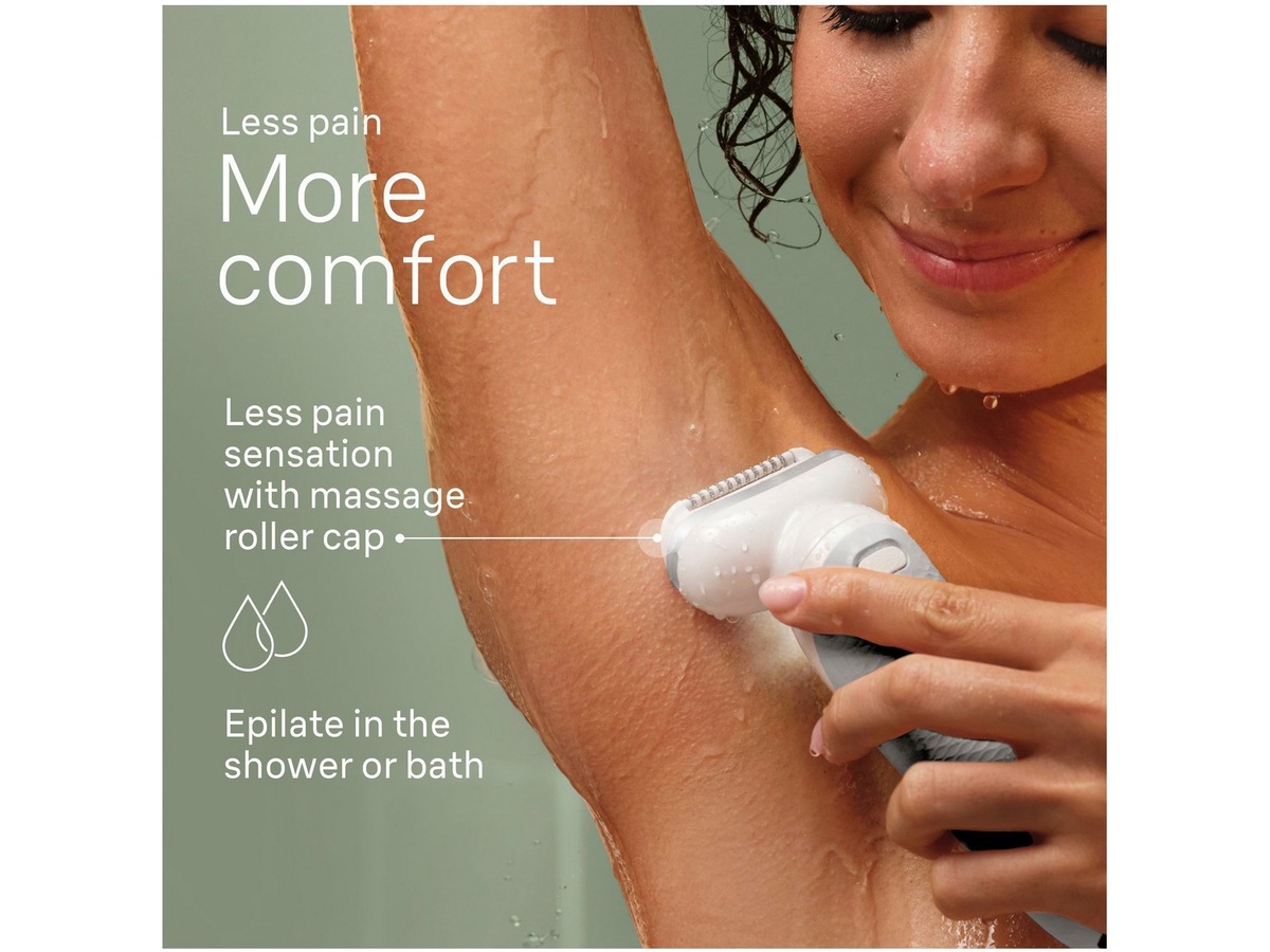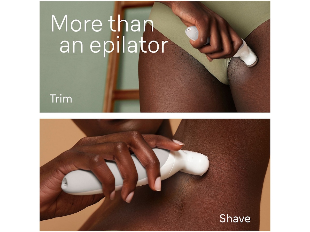 Raskt og effektivt: Det brede, bevegelige hodet følger enkelt kroppens konturer for en effektiv epilering. Epilatoren fanger opp korte hår (0,5 mm) som voks ikke kan.