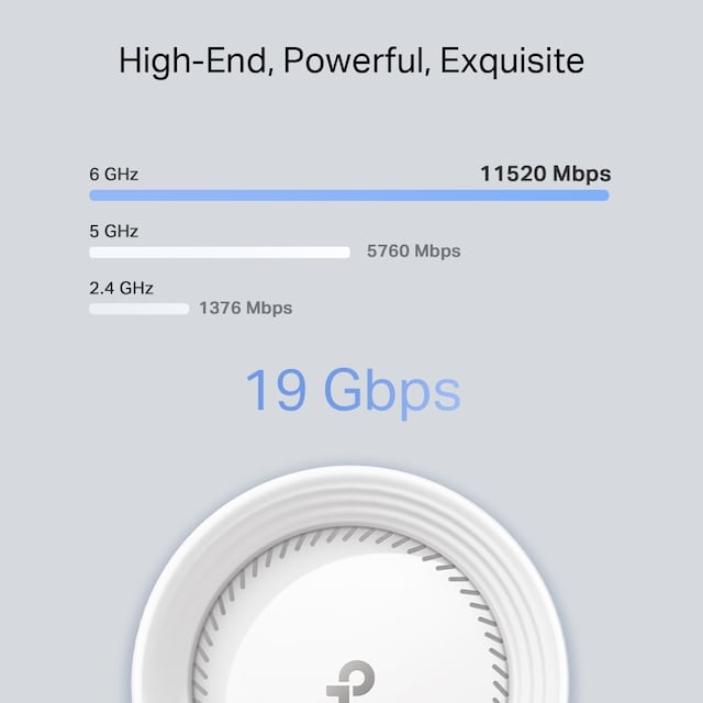 - 12-strøms 19 Gbps Tri-Band WiFi – 11520 Mbps (6 GHz) + 5760 Mbps (5 GHz) + 1376 Mbps (2,4 GHz).†